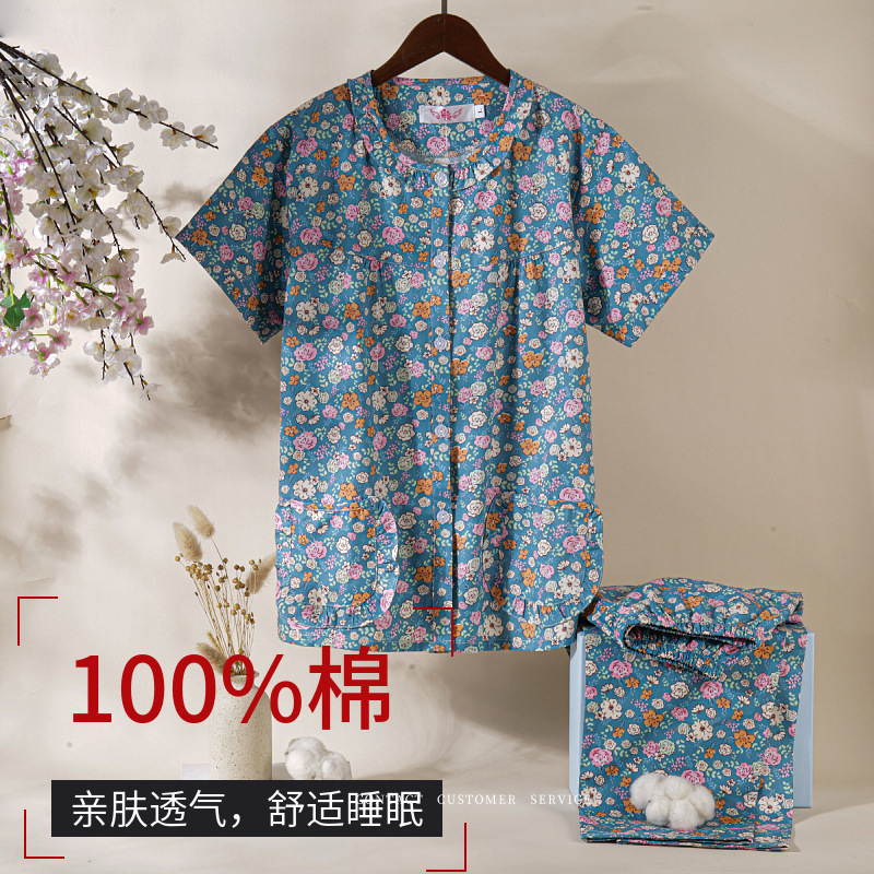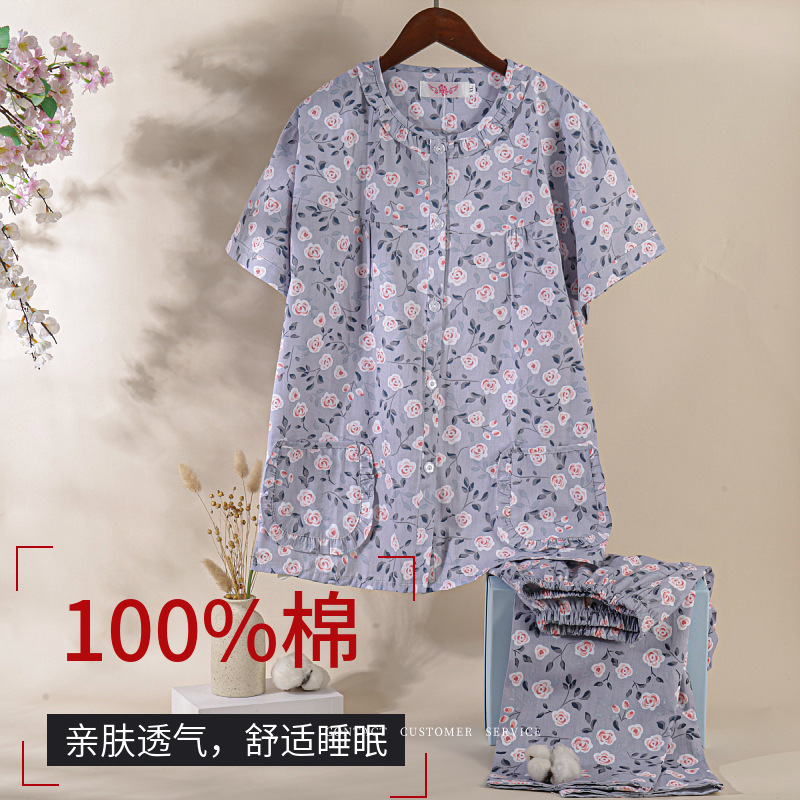 잠옷 여자 여름 반팔 순면 크루넥 한국식 가디건 짠 면 천 중년 잠옷 가정복 세트스토어 가기