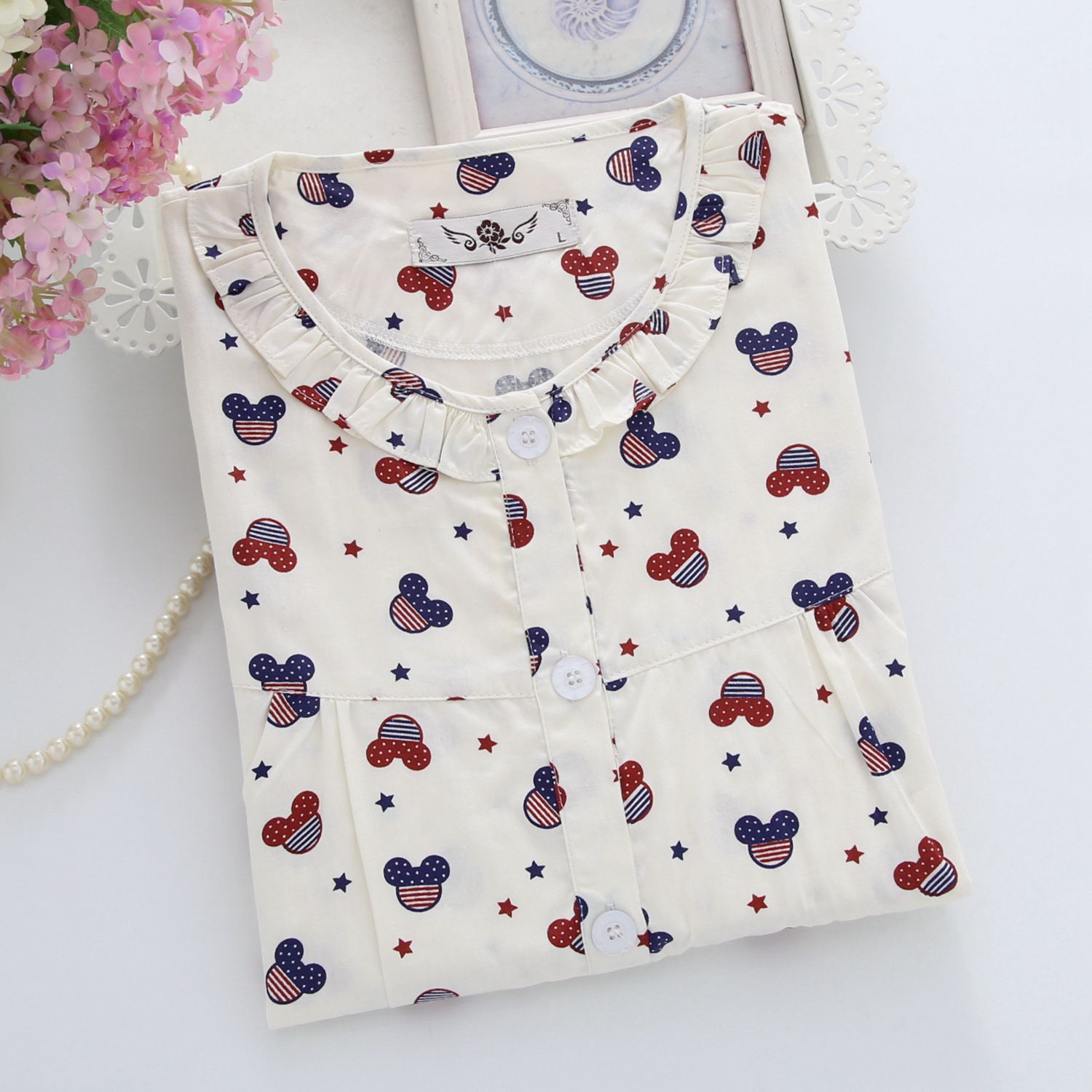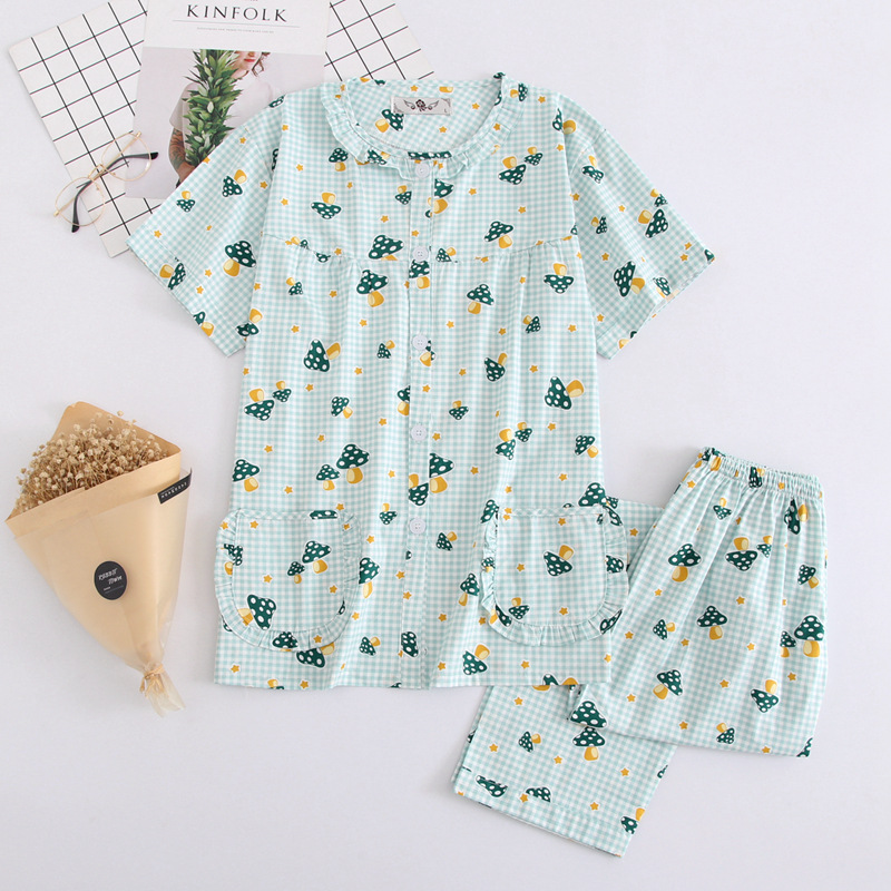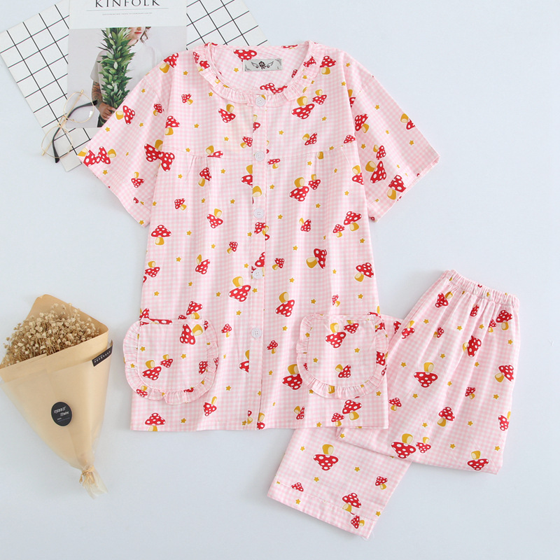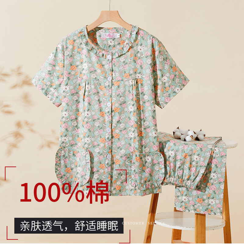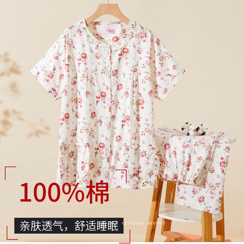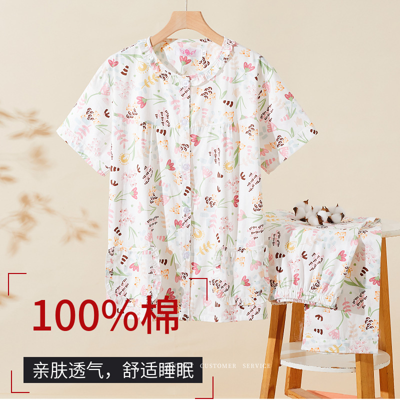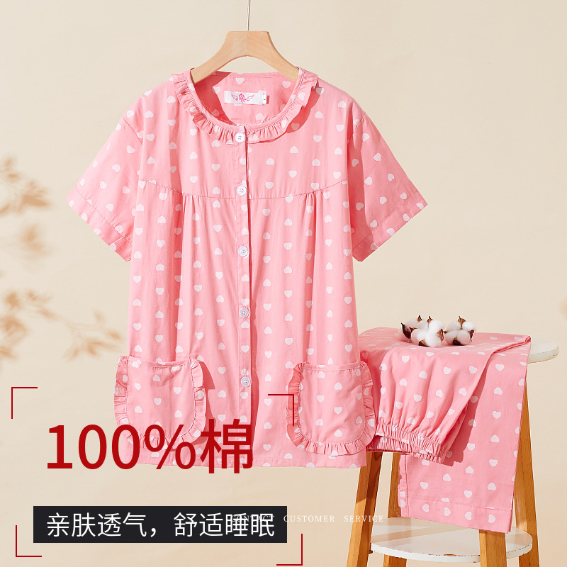 잠옷 여자 여름 반팔 순면 크루넥 한국식 가디건 짠 면 천 중년 잠옷 가정복 세트