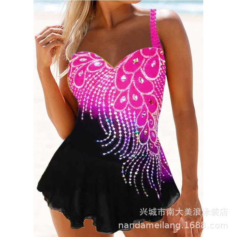 2023 신상 유럽 및 미국 여성용 대형 수영복, 여성용 피닉스 꼬리 프린트 스커트, 루즈핏 분리형 원피스 수영복