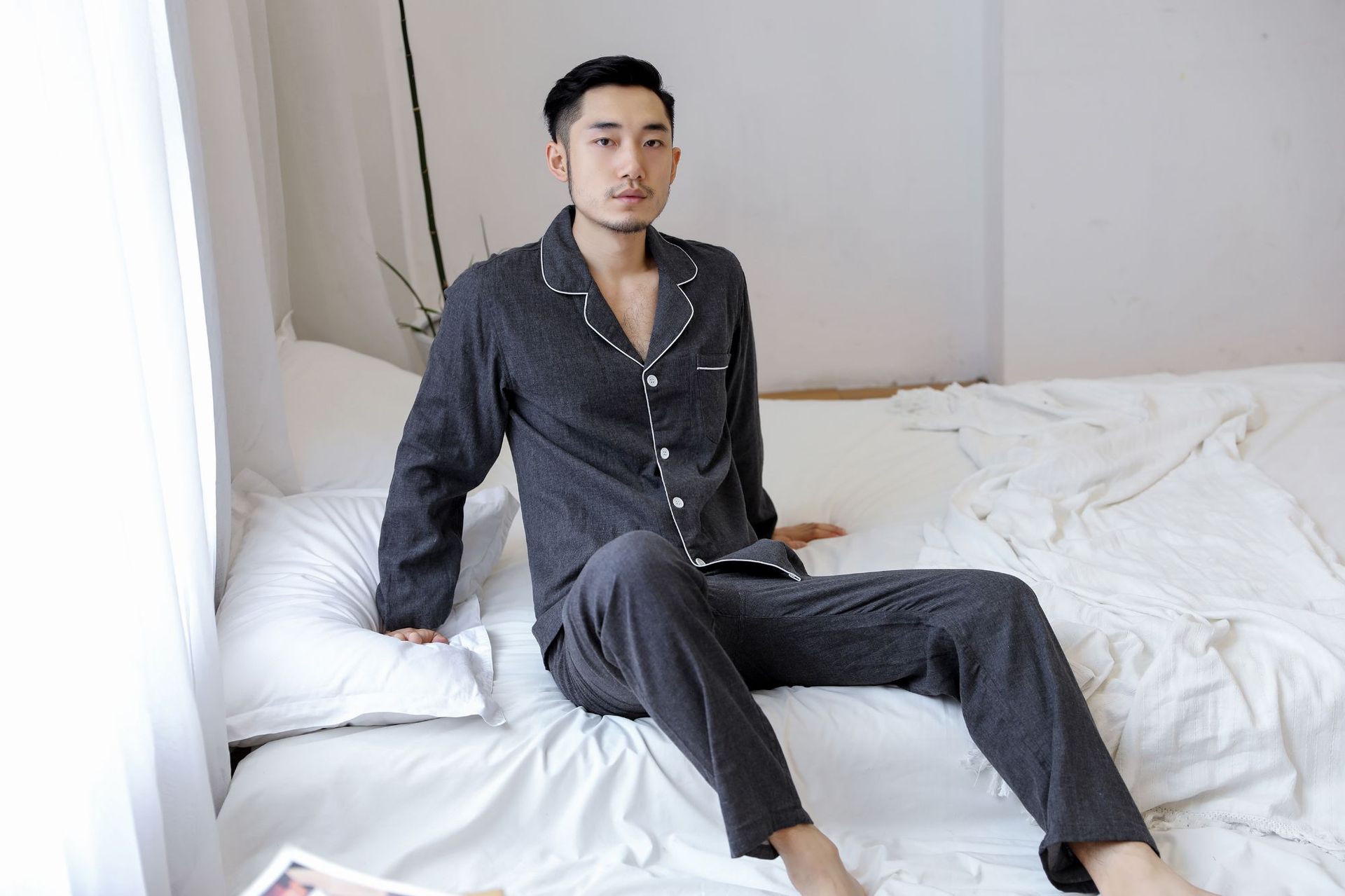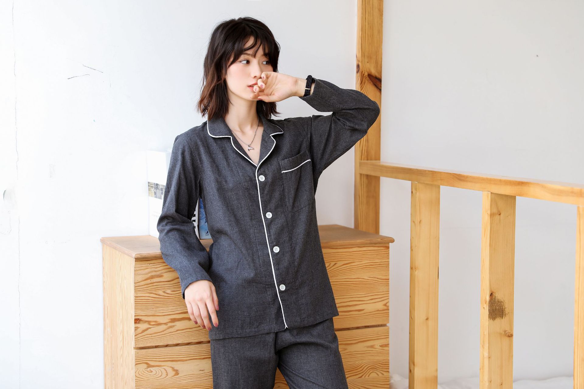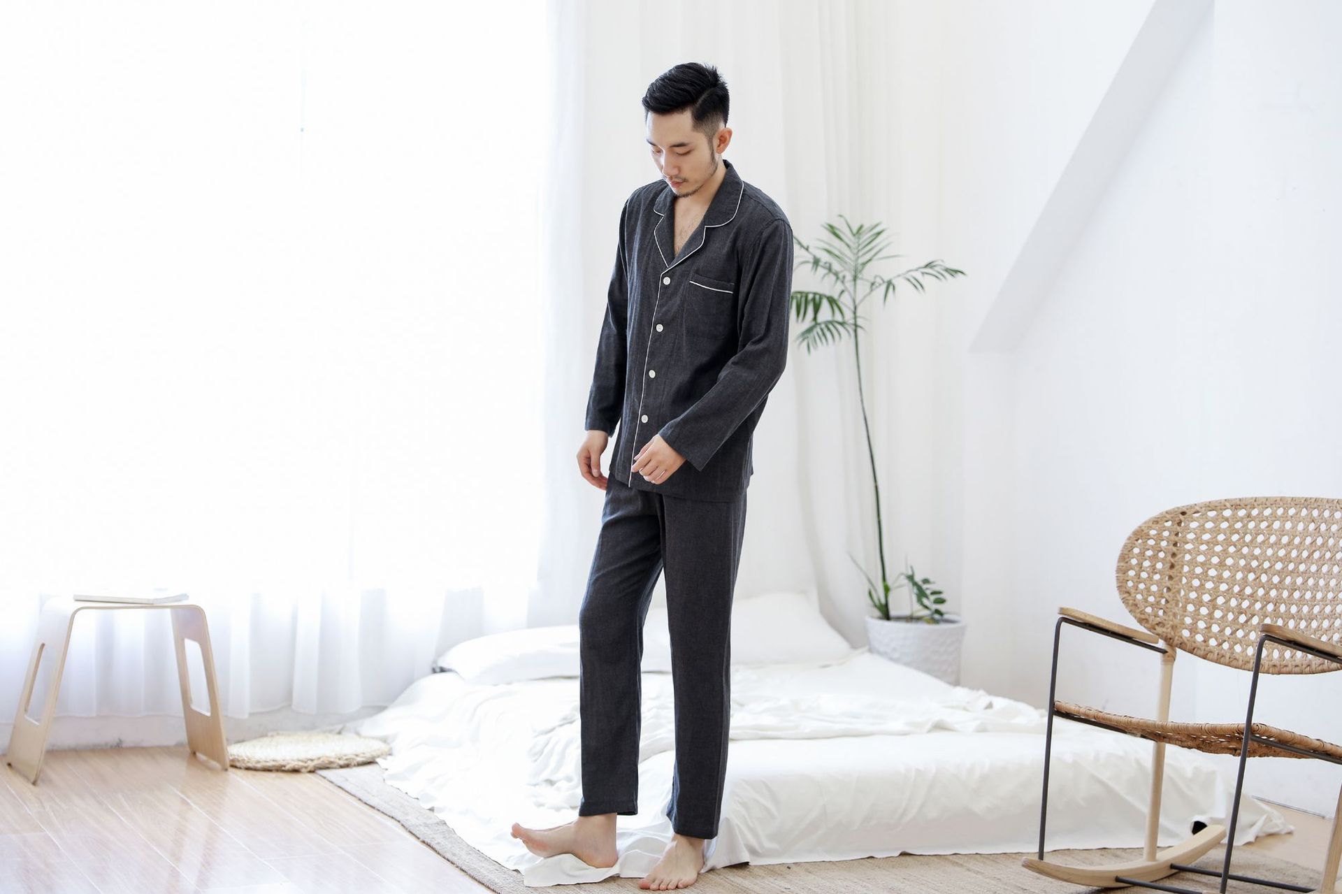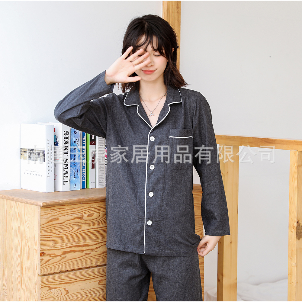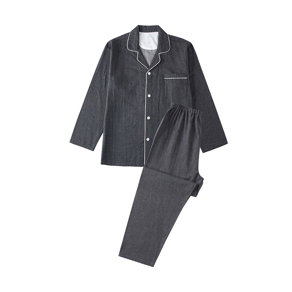 일본식 무지 남성용 순면 이중 거즈 무지 잠옷 세트 순면 홈웨어 커플 스타일 컬러 스펀 카본 블랙