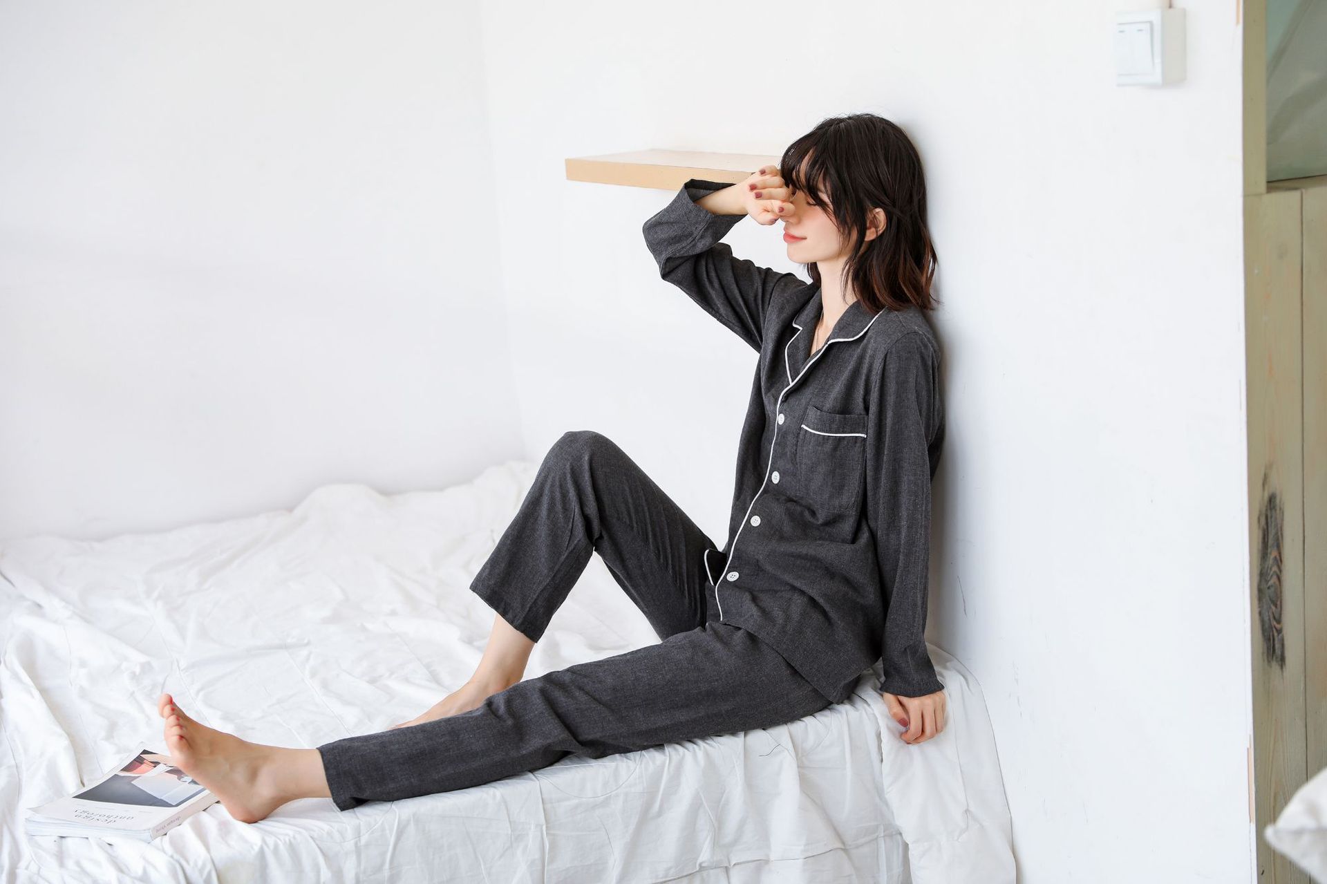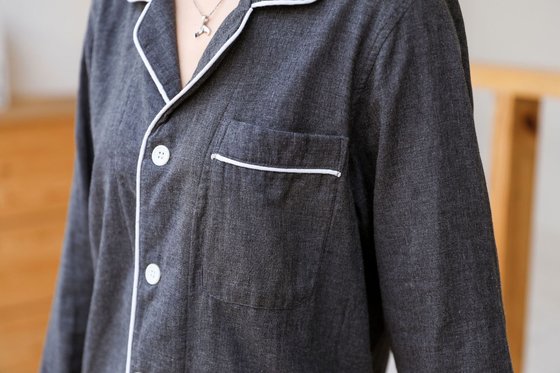 일본식 무지 남성용 순면 이중 거즈 무지 잠옷 세트 순면 홈웨어 커플 스타일 컬러 스펀 카본 블랙스토어 가기
