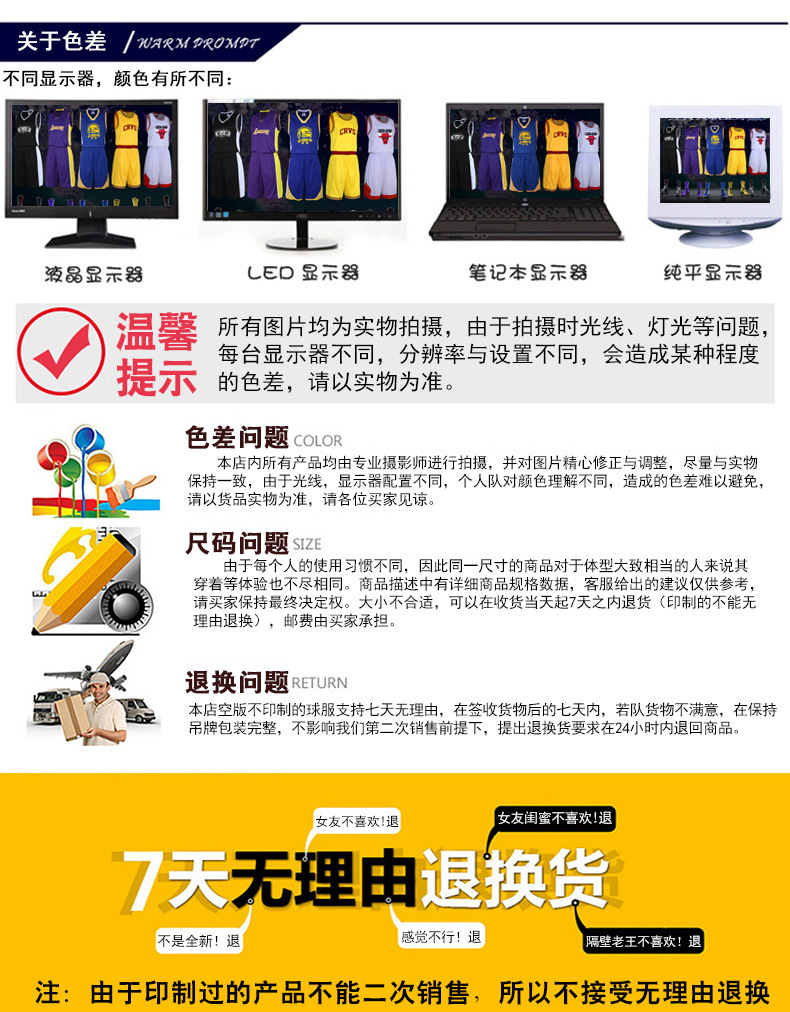所有球衣出厂均无号码,若要印号请联系客服说明。加印字或臂章LOGO的衣服无明显质量问题一律不接受任何原因退换货!