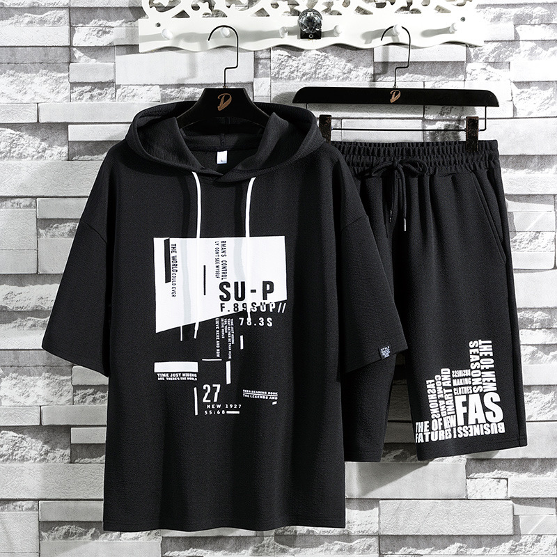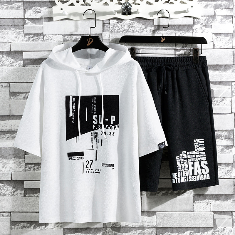 반팔 티셔츠 남자의 2023 여름 새로운 한국 스타일 유행 투피스 유행 브랜드 스포츠 캐주얼 더피 핸섬 세트 남성