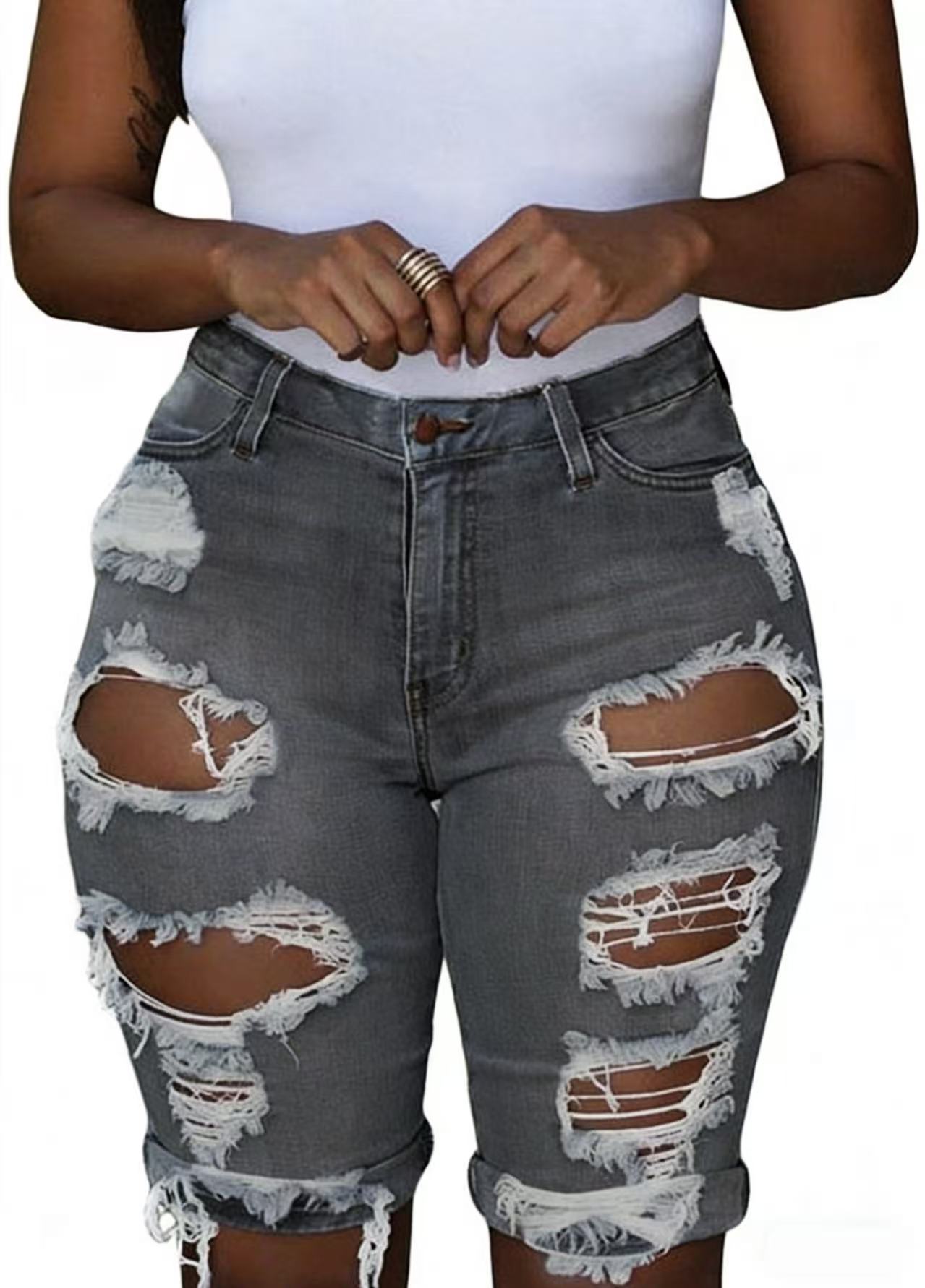 8851 # 유럽풍 데미지 데님 반바지 여성용 슬림핏 2024 신상 패션 캐주얼스토어 가기