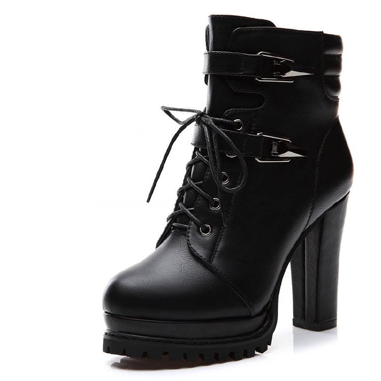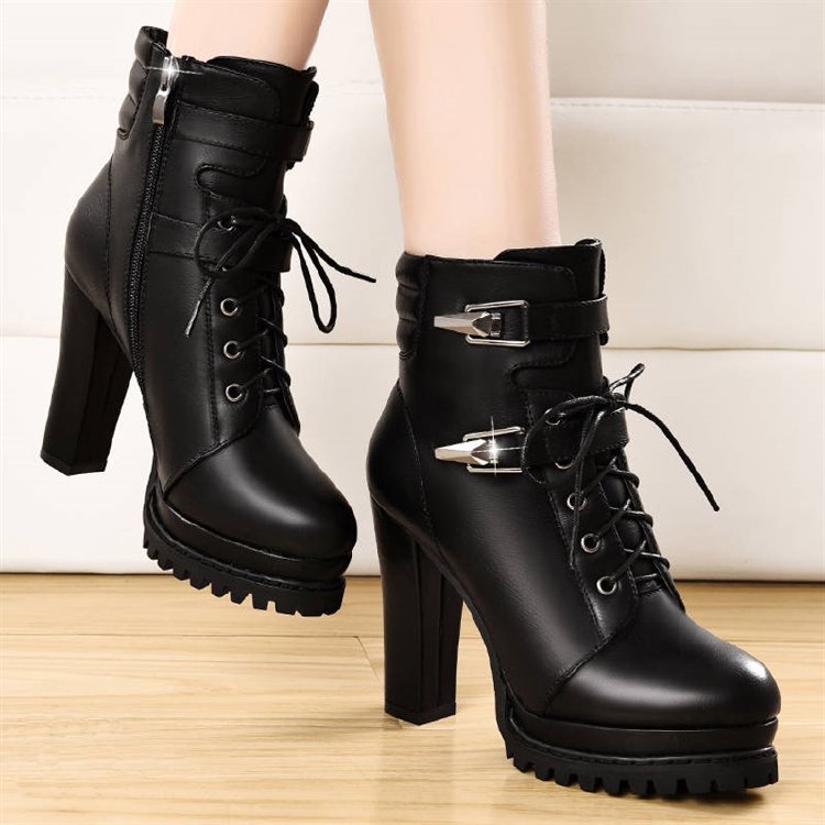 블랙 마틴 부츠 여성용 하이힐 2019 새로운 모든 매치 플랫폼 레이스 업 청키 힐 라운드 토 앵클 부츠 가을과 겨울