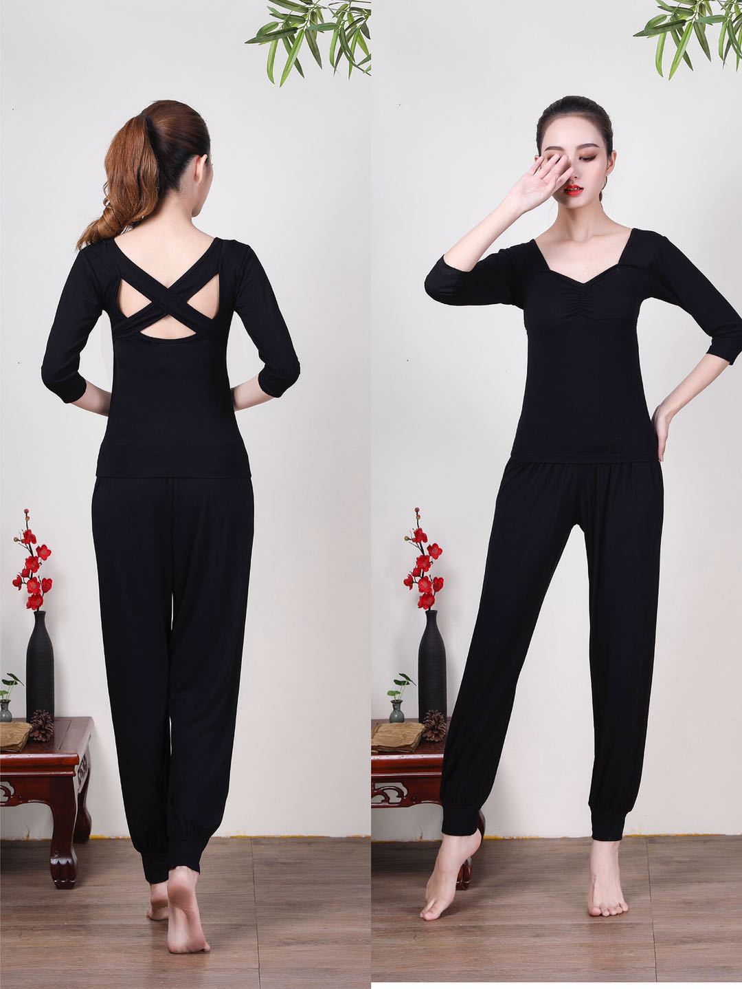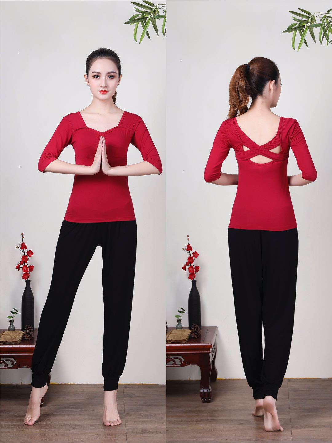 • 버건디 미들 슬리브 + 블랙 하렘 팬츠