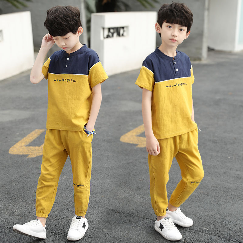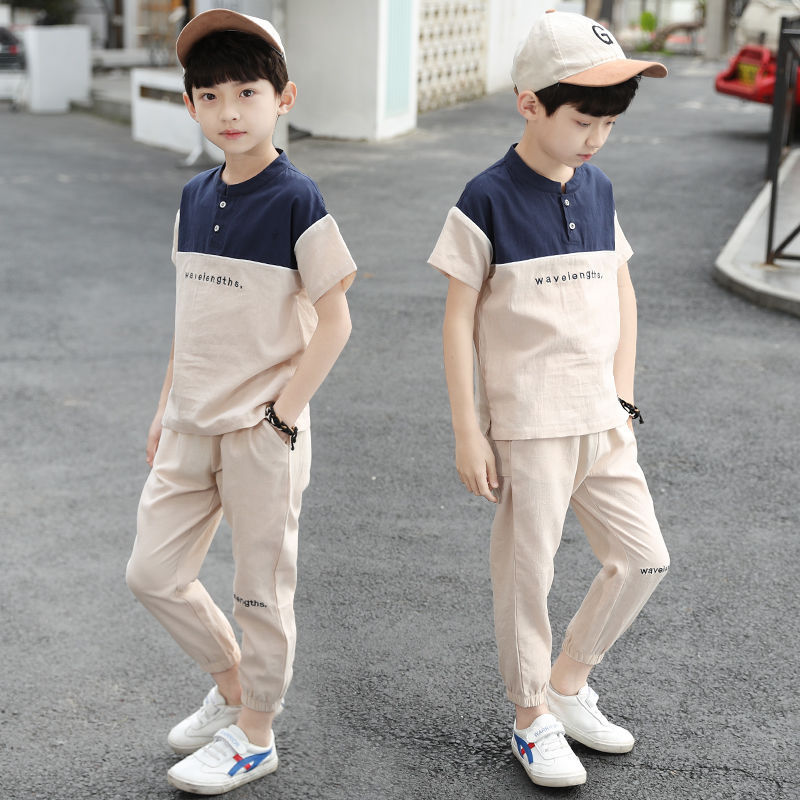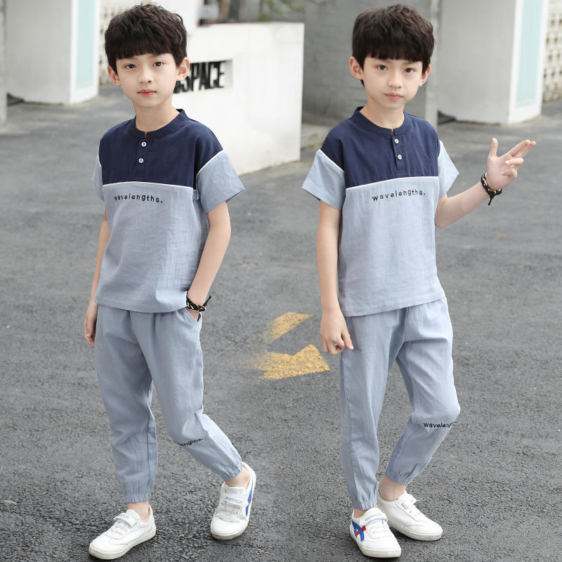 남아 여름 세트 아이스 실크 코튼 린넨 쿨 투피스 세트 중간 및 큰 어린이 발목 길이 바지 반팔 세트 어린이 여름 패션