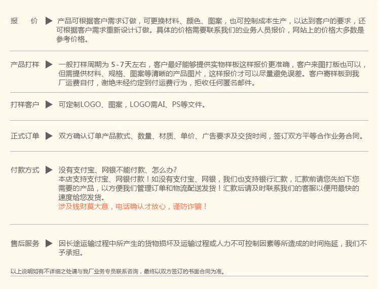 客户提供设计稿,我司确认文件可制作,客户支付打样费,我司安排打样并寄出样品,客户确认样品, 签定 大货生产合同。客户支预付30%定金,我司安排生产大货,大货生产完成后(拍照或寄大货样客户确认),客户付清余款,我