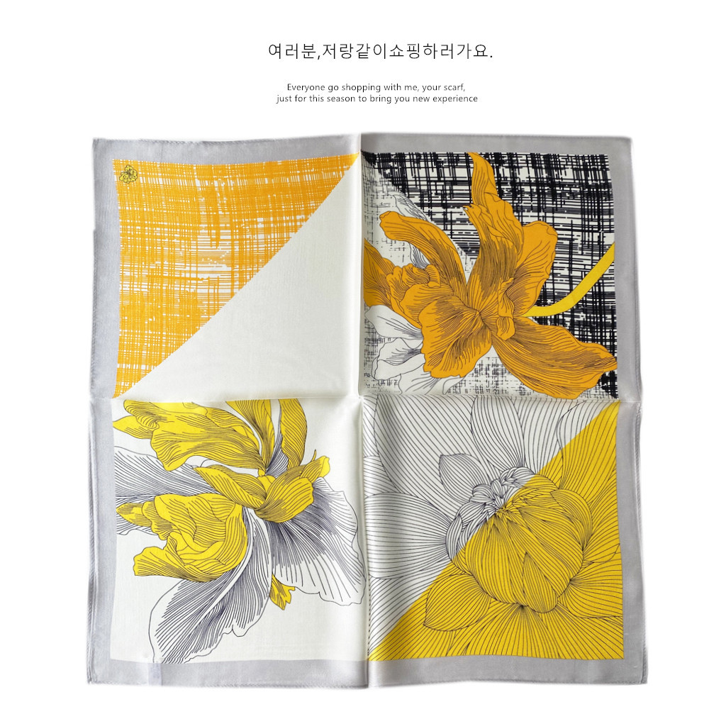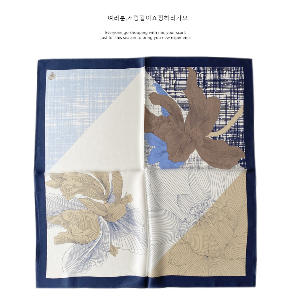 봄 새로운 실크 스카프 한국 폭발적인 꽃 작은 사각형 스카프 유행 우아한 일반 크레이프 새틴 장식 작은 스카프 여성용