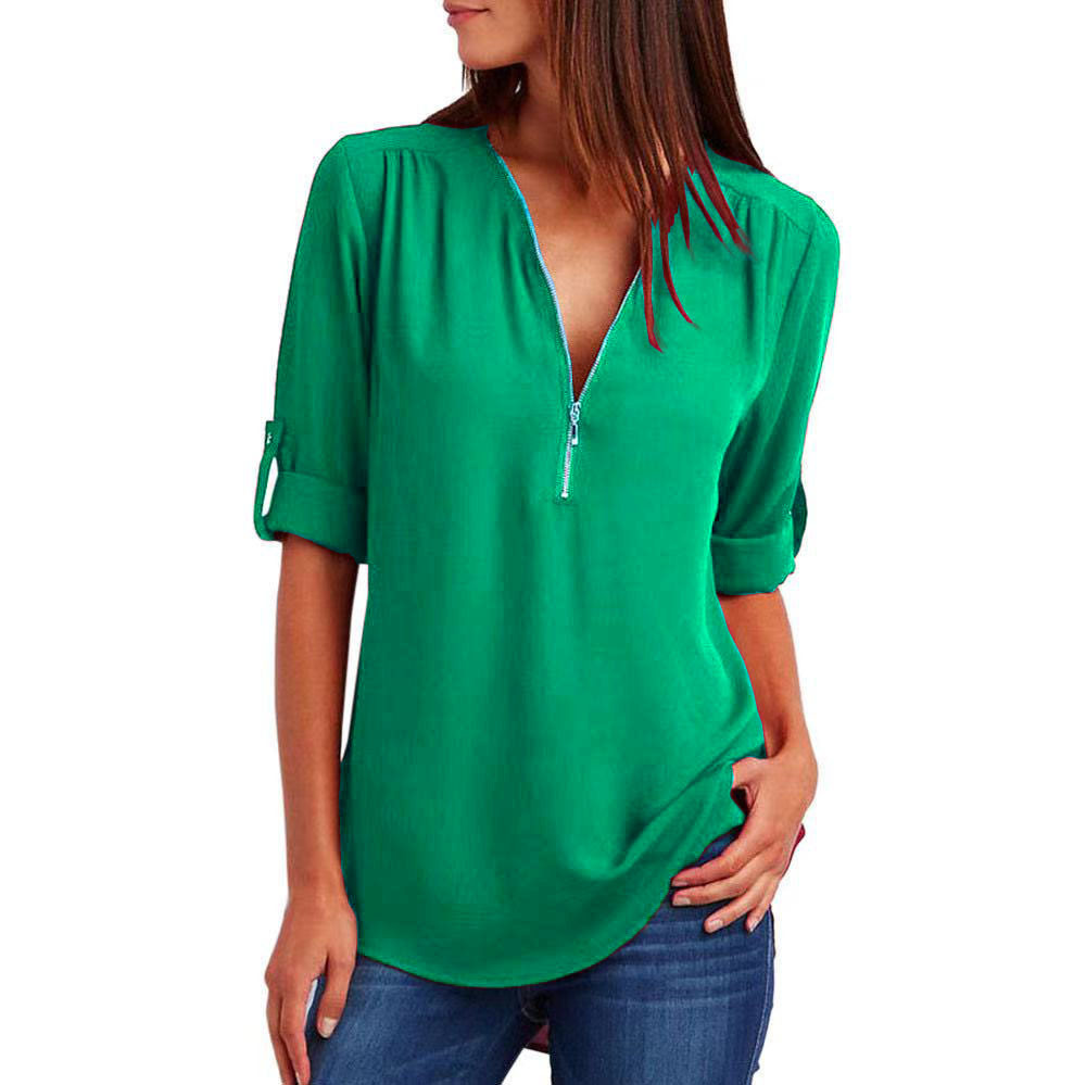 크로스-border 뜨거운 새로운 탑 유럽과 미국 여성의 긴 소매 베이스 셔츠 아마존 플러스 사이즈 지퍼 V-넥 셔츠스토어 가기