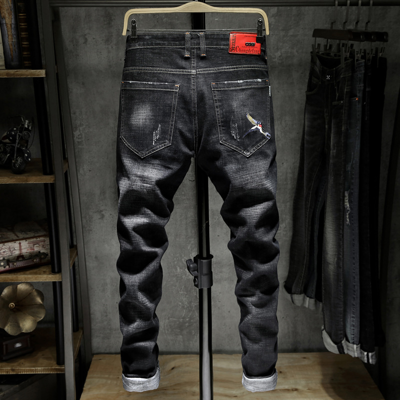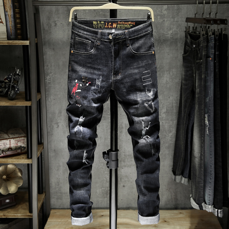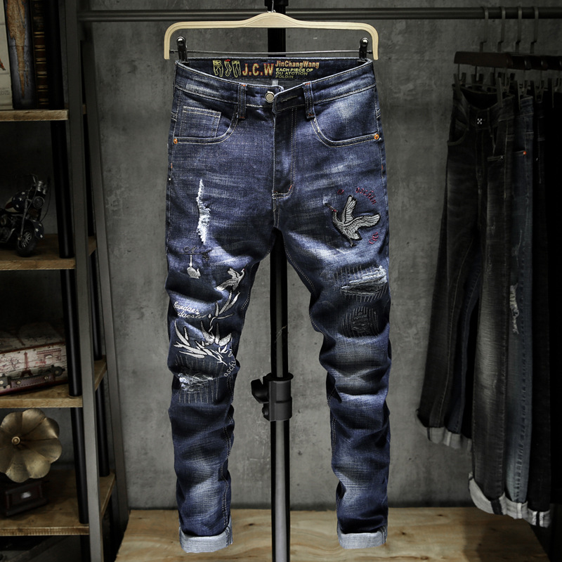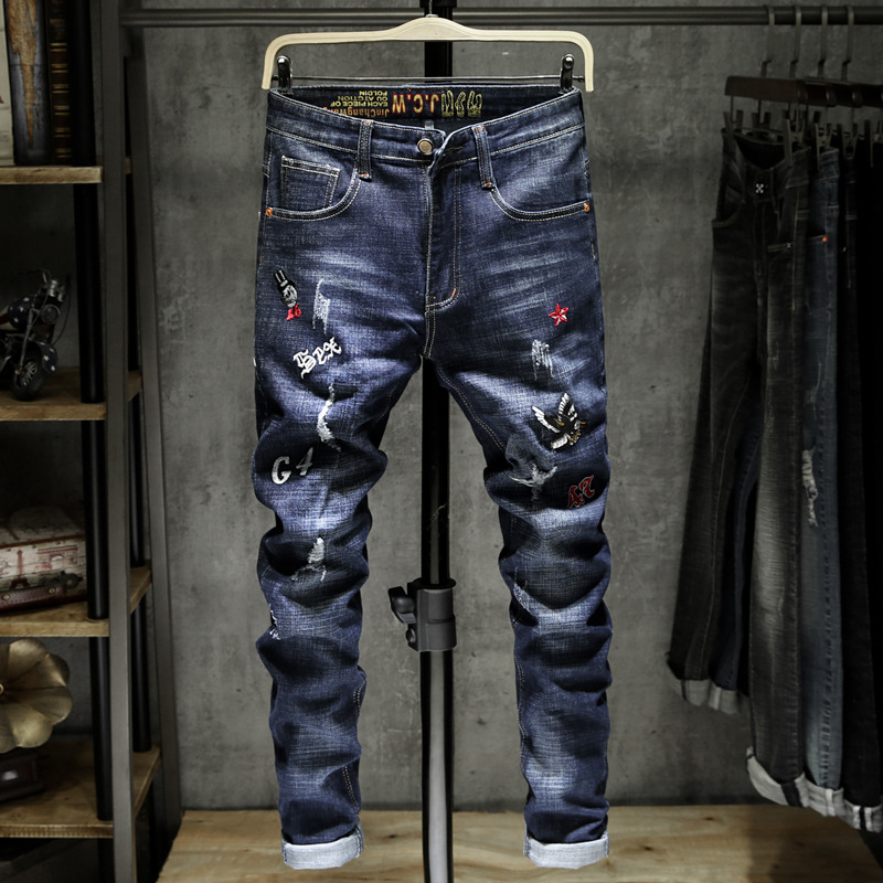 유럽 역 대외 무역 AliExpress 자수 청바지 남자의 찢어진 에스닉 패션 브랜드 패션 작은 스트레이트 긴 바지스토어 가기