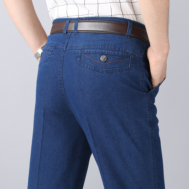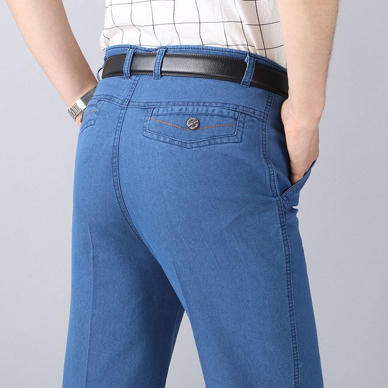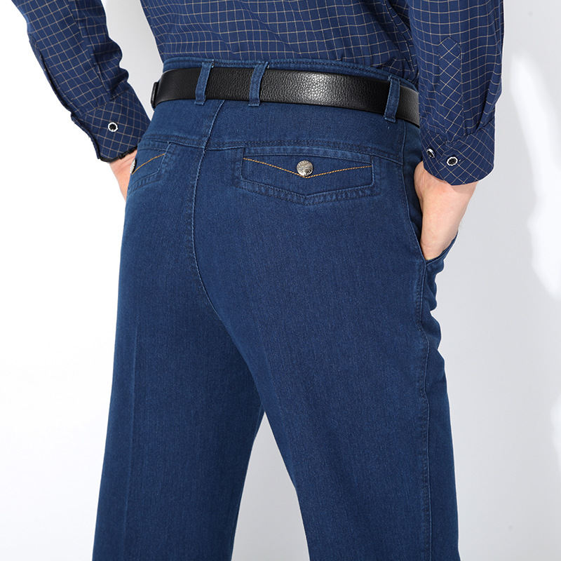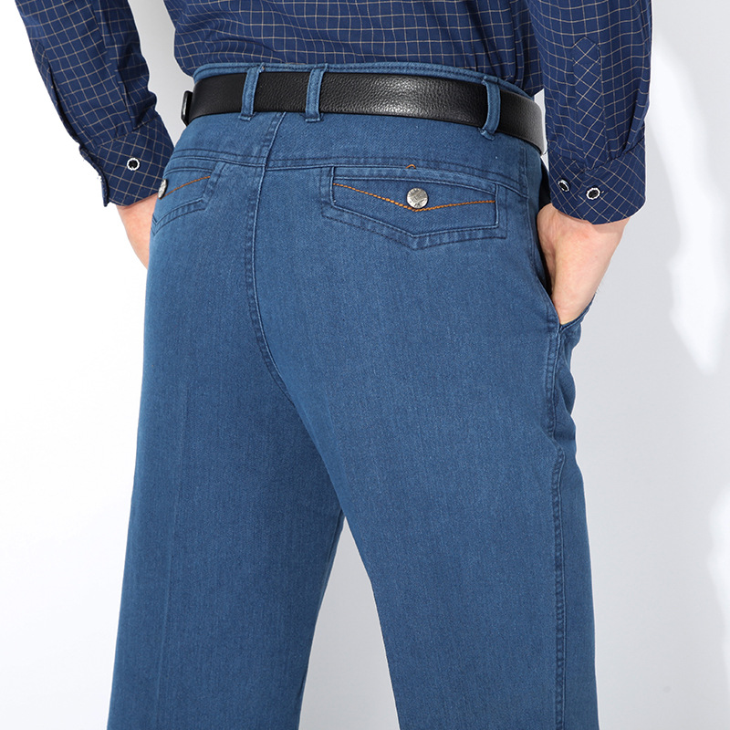봄과 여름 얇은 남성용 청바지 남성용 스트레이트 루즈한 캐주얼 바지 남성용 바지 중년 아빠의 하이 웨이스트 탄성 바지