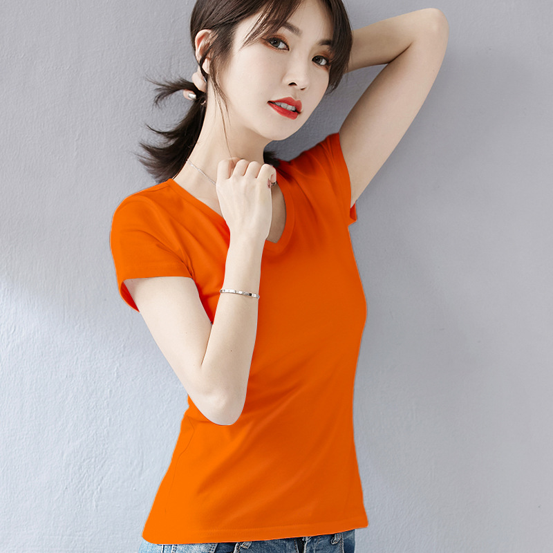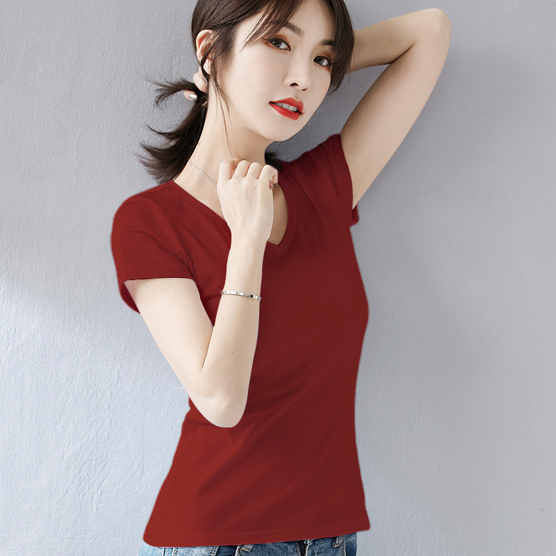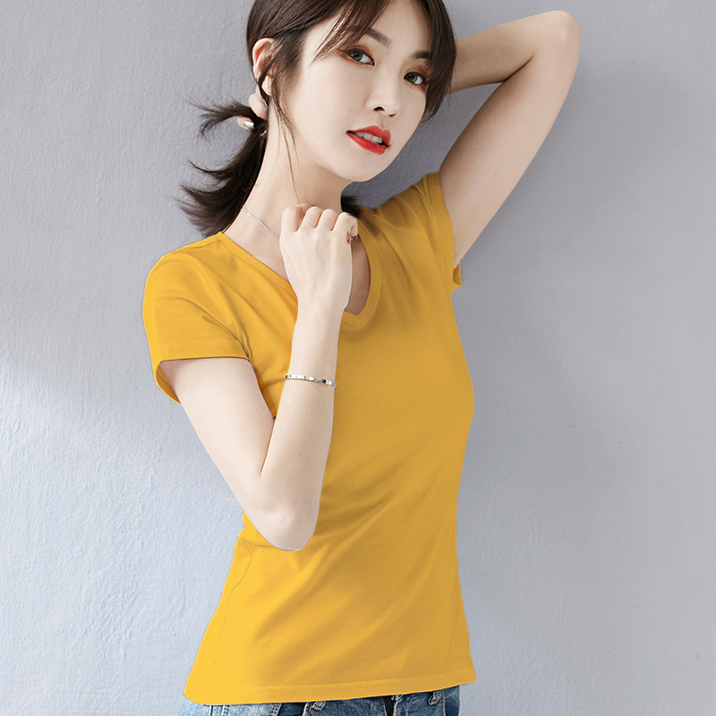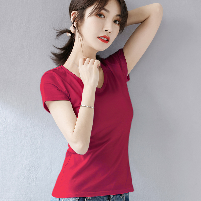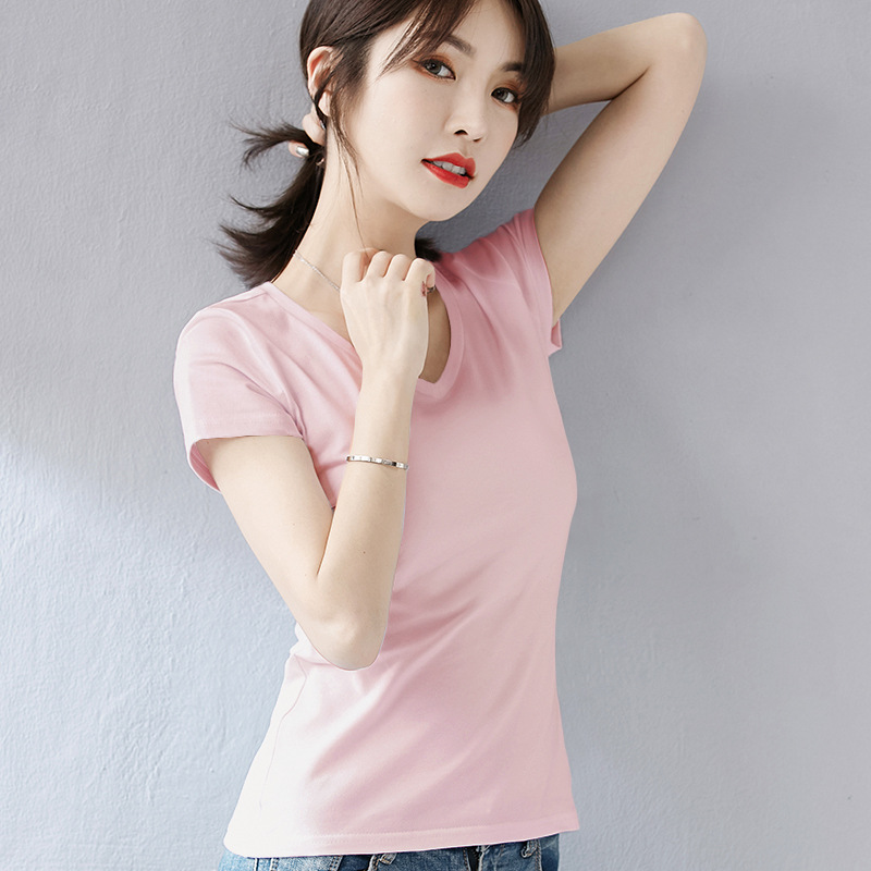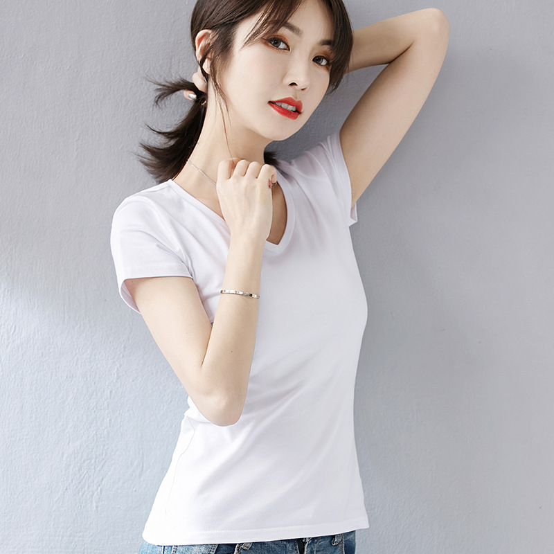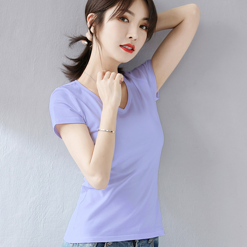 봄 순수 코튼 솔리드 컬러 티셔츠 여성 반팔 슬림 V 꽉 끼는 여성의 섹시한 새로운 트렌디 티셔츠 탑 반팔 짧은 스타일스토어 가기
