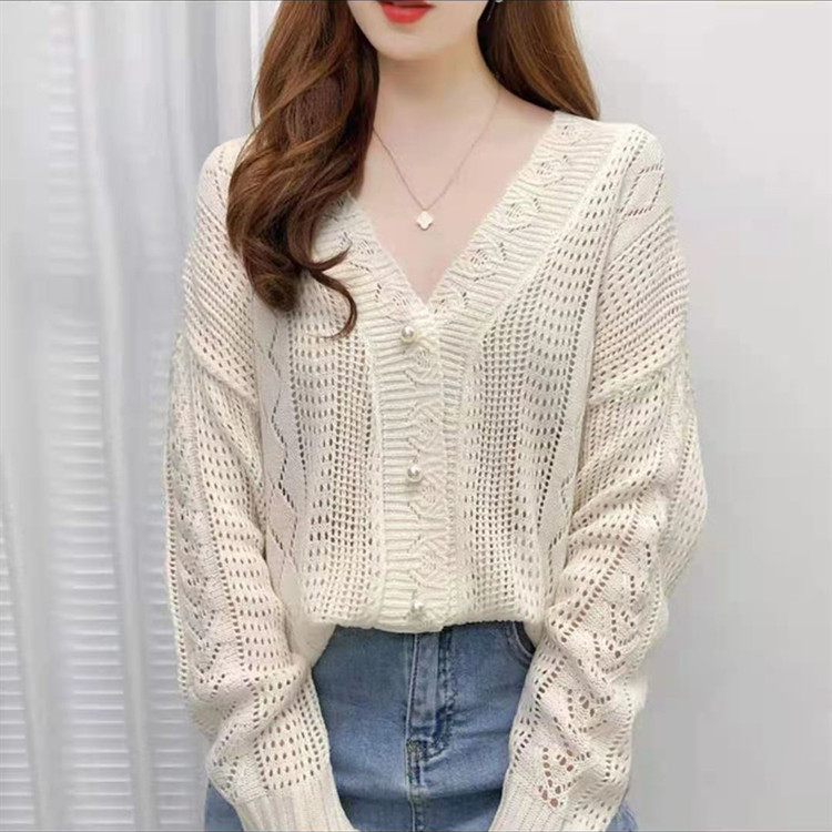 봄과 가을 새로운 한국 빈티지 중공 레이백 스타일 울 재킷 크로 셰 뜨개질 스웨터 V-넥 니트 가디건 여성용