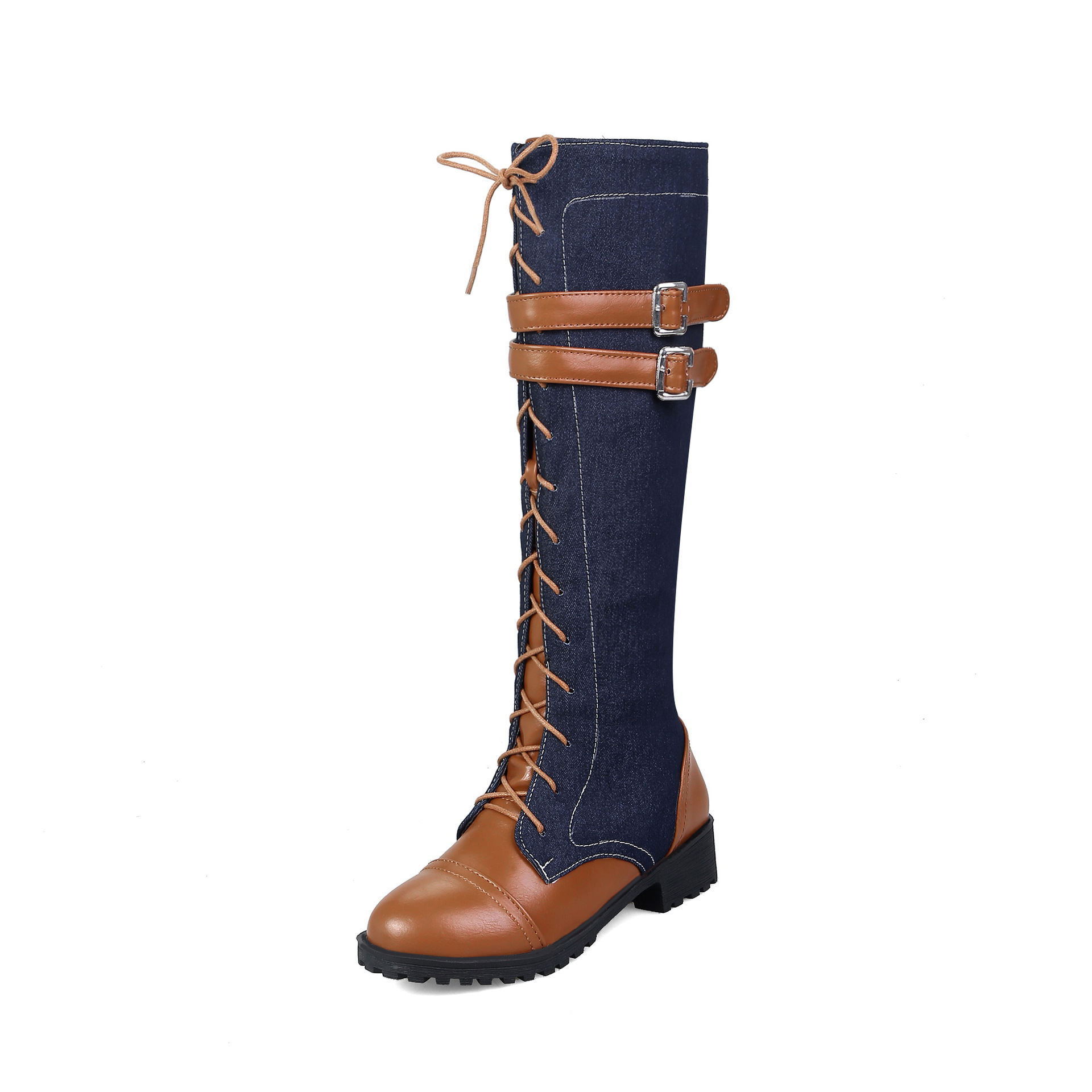 데님 부츠 가죽 버클 데님 외국 무역 여성 부츠 플러스 사이즈 40-46 높은 두꺼운 뒤꿈치 여성 신발 낮은 굽 지퍼