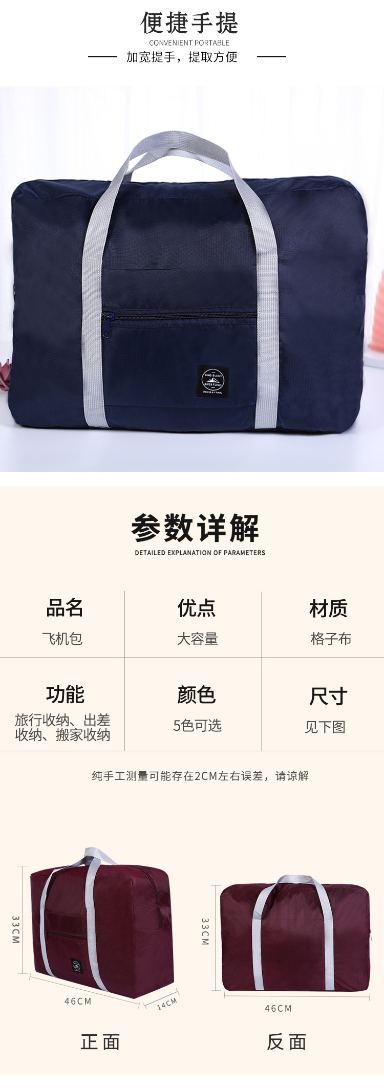 2세대 항공기 가방 대용량 기내 여행용 휴대용 가벼운 핸드백 옷 포장 옥스포드 천 여행 가방