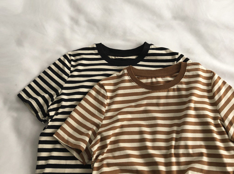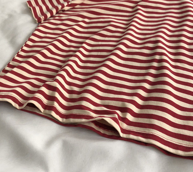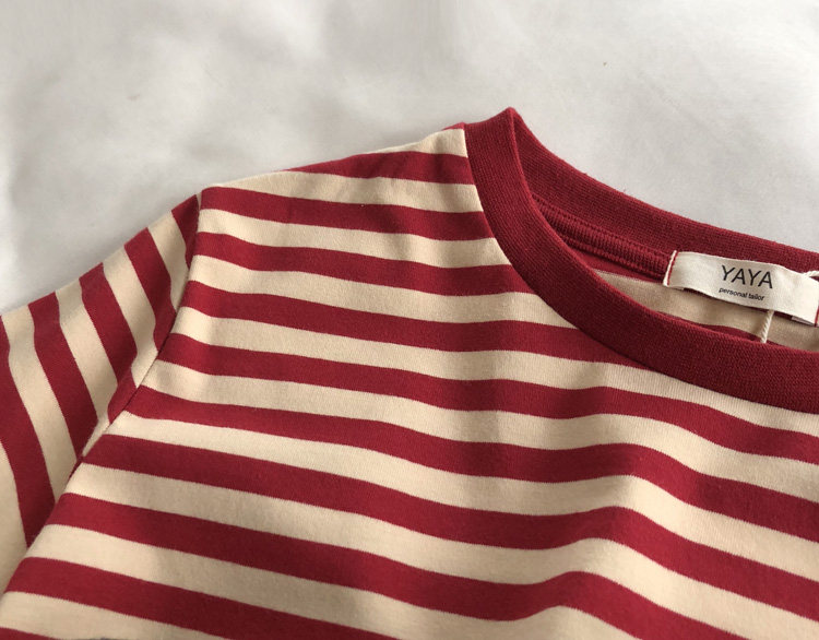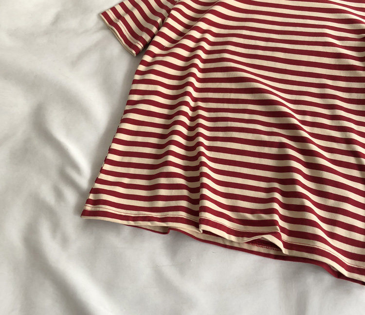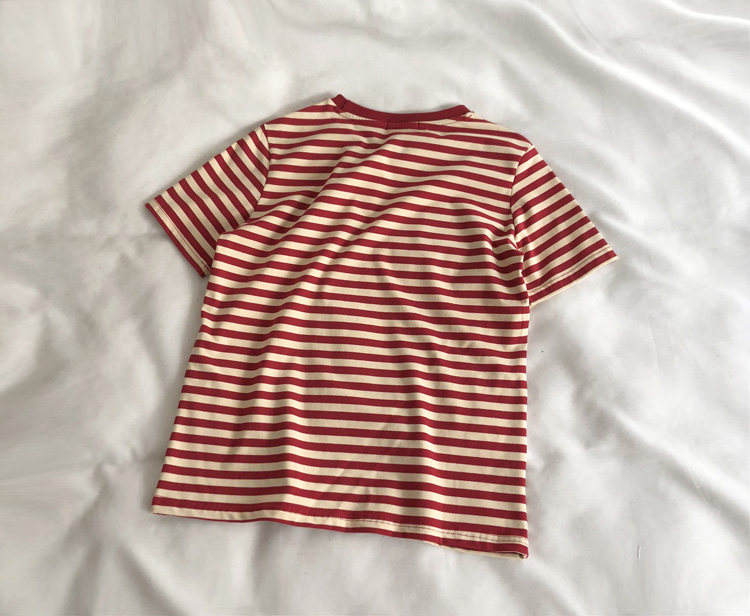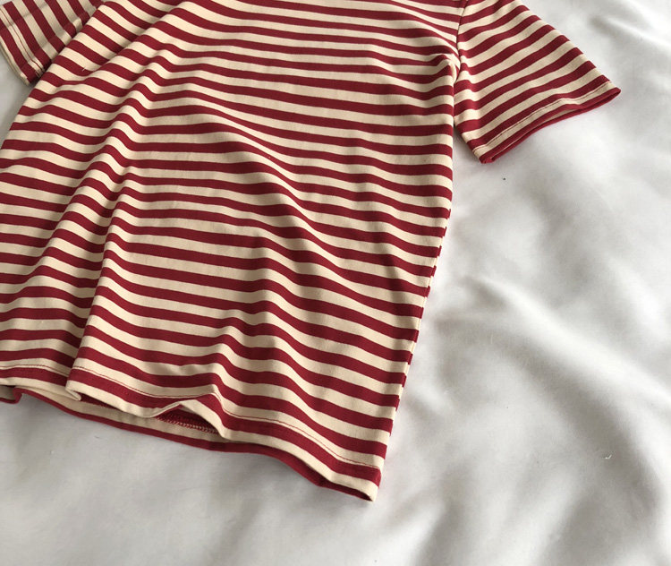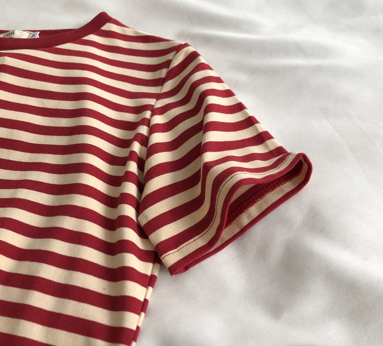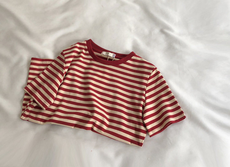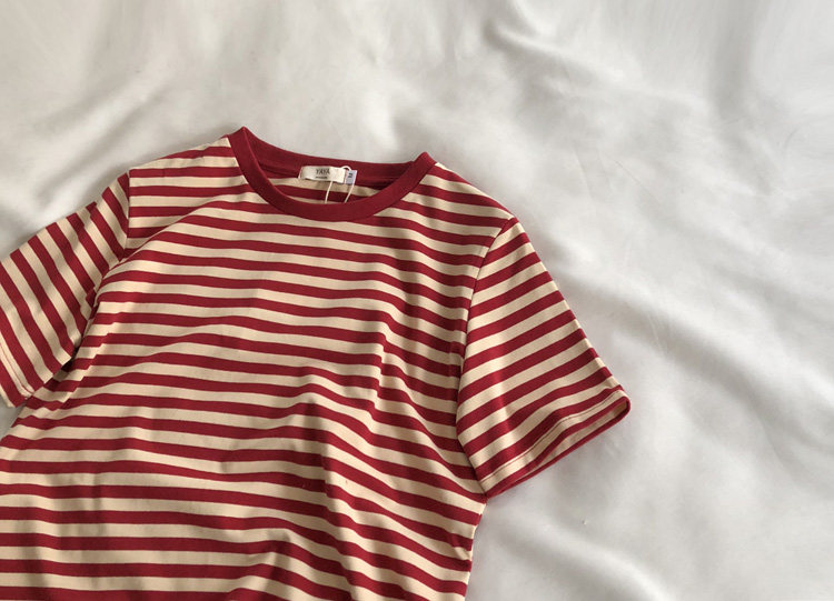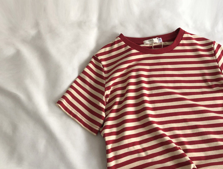 레드 라이스 스트립/레트로 화이트 새로운 색상 매칭 가로 스트라이프 라운드 넥 셔츠 반팔 면 티셔츠 여성 탑 베이스 셔츠 여름 티스토어 가기
