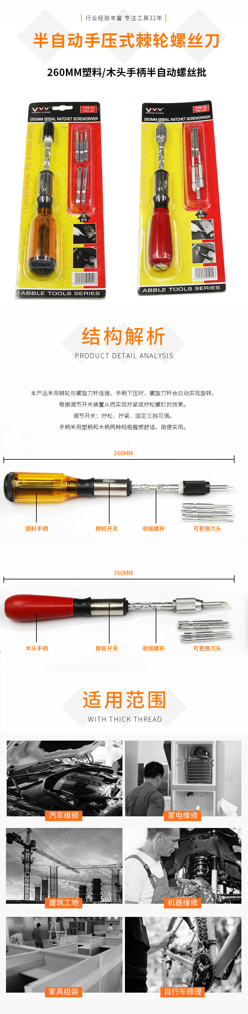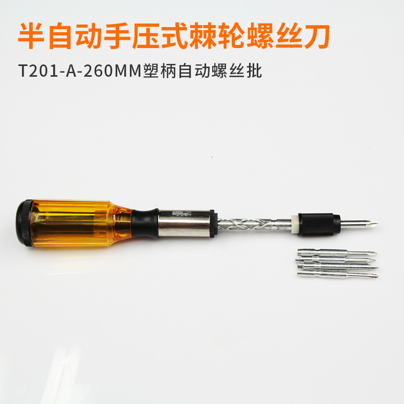 本产品为半自动手压式棘轮螺丝刀,通过手柄下压,螺旋刀会自动实现旋转,将螺丝拧进和拧出,非常方便省事。是家庭和各场合作业必不可少的工具。