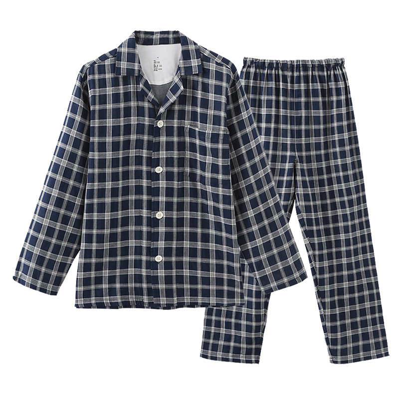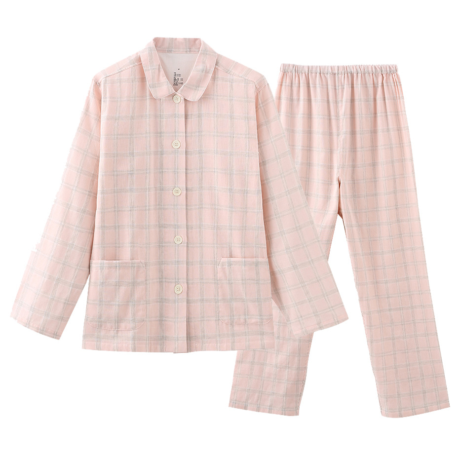 커플용 홈웨어 여성용 순면 이중 거즈 루즈핏 잠옷 남성용 얇은 긴팔 체크무늬 잠옷 세트