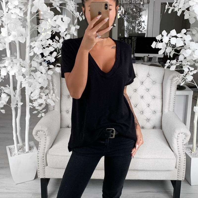 아마존 소원 여자의 2023 여름 V-넥 느슨한 해외 무역 캐주얼 반팔 티셔츠 베이스 셔츠 단색 멀티 컬러 재고