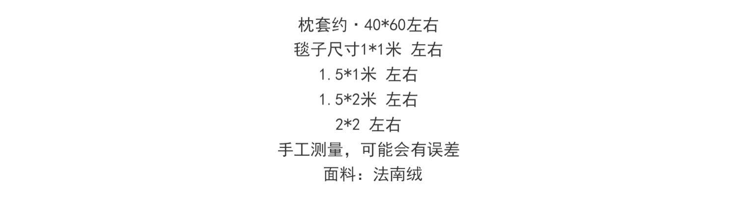 4个尺寸的毯子,分别是100*95cm,1.4*2米,1.9*2米,1.5*1米