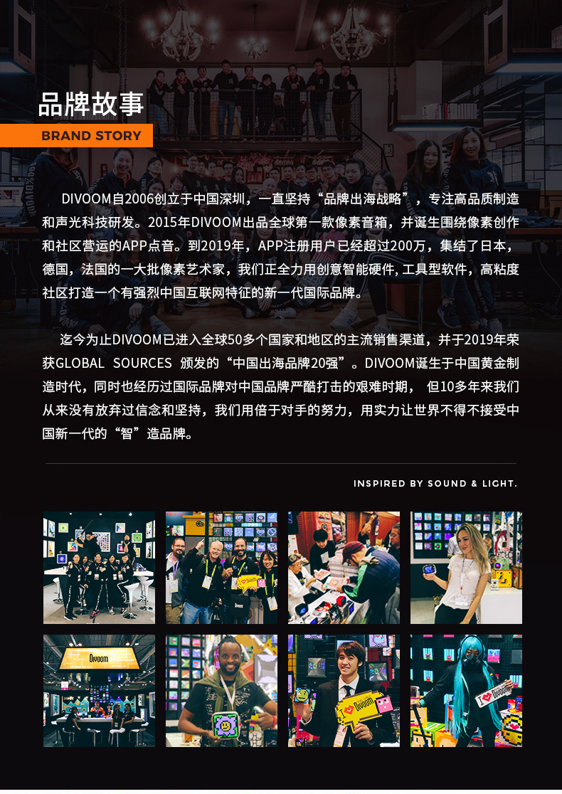 迄今为止DIVOOM已进入全球50多个国家和地区的主流销售渠道,并于2019年荣获GLOBAL SOURCES颁发的"中国出海品牌20强"。DIVOOM诞生于中国黄金制造时代,同时也经历过国际品牌对中国品牌严酷打击的艰难时期,但10多年来我们从来没有放弃过信念和坚持,我们用倍于对手的努力,用实力让世界不得不接受中国新一代的"智"造品牌。