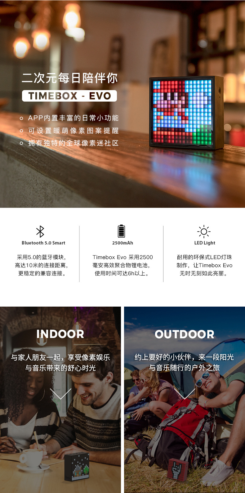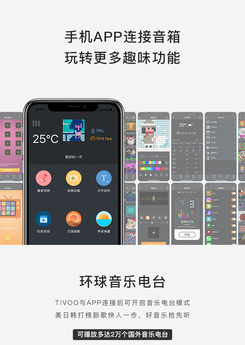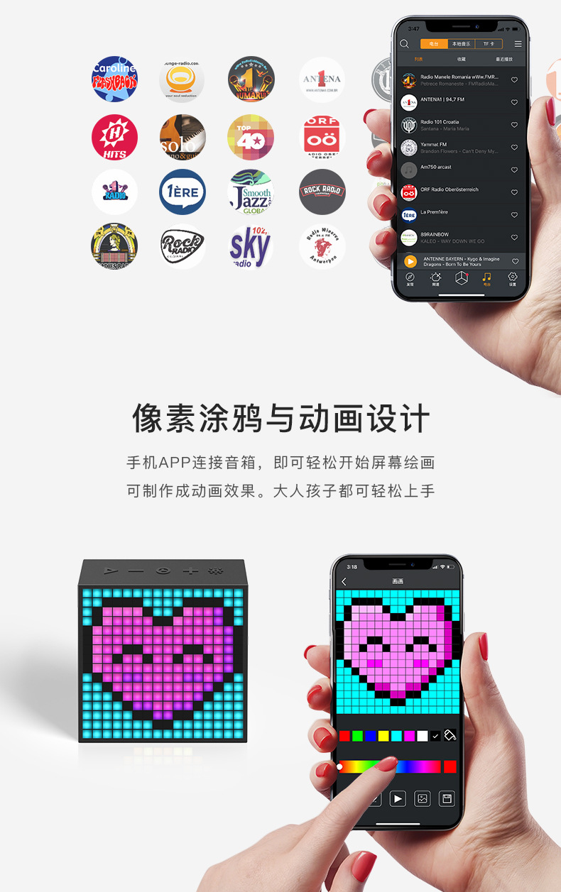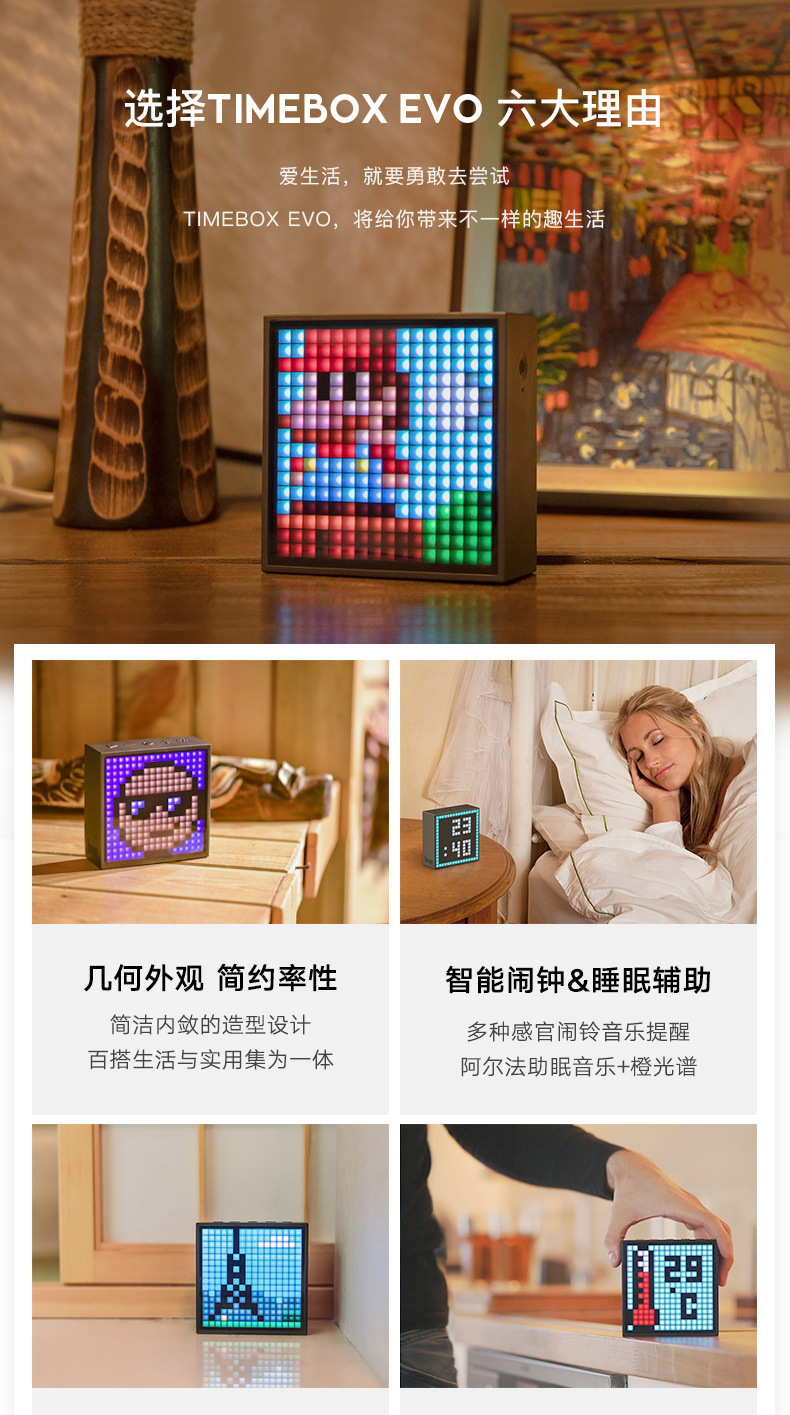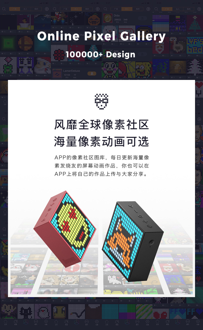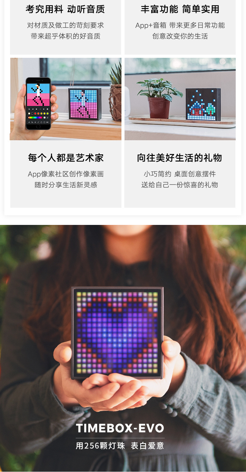点音音箱(英文DIVOOM),自2006年创立于中国深圳,一直坚持"品牌出海战略",专注高品质制造和声光科技研发。2015年DIVOOM出品全球第一款像素音箱,并诞生围绕像素创作和社区营运的APP点音。到2019年,APP注册用户已经超过200万,集结了日本,德国,法国的一大批像素艺术家,我们正全力用创意智能硬件,工具型软件,高粘度社区打造一个有强烈中国互联网特征的新一代国际品牌。