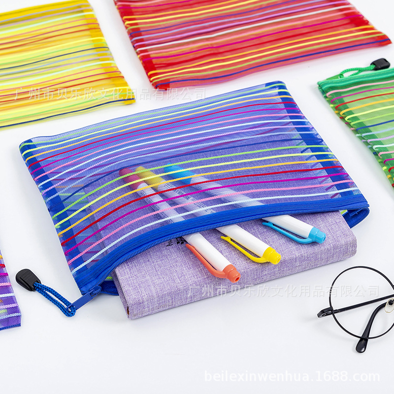 A5 다채로운 무지개 파일 가방 투명 거즈 지퍼 가방 정보 가방 저장 가방 줄무늬 메쉬 문구 가방스토어 가기