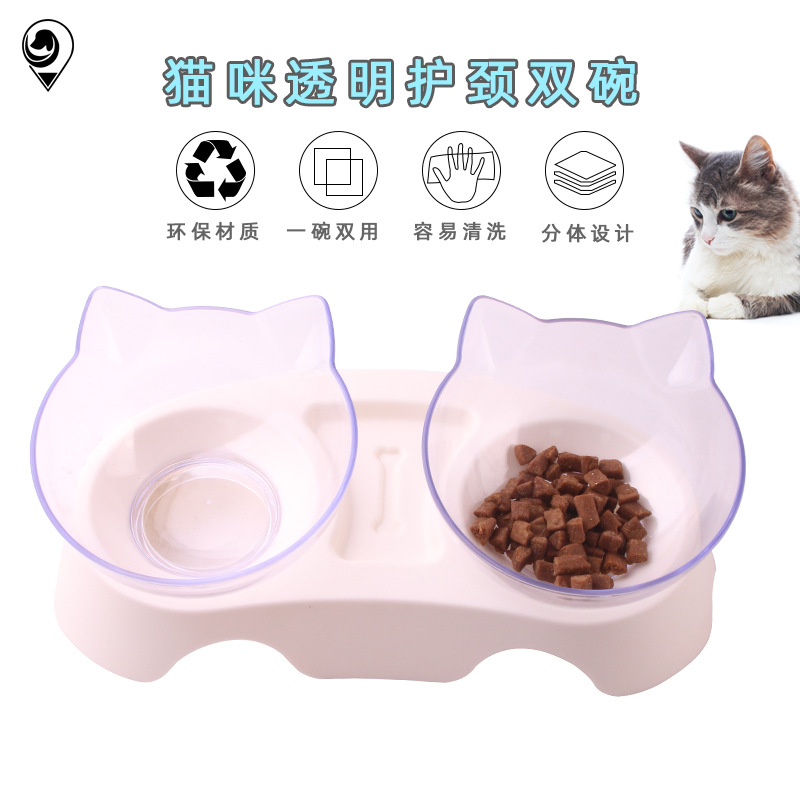 애완동물 용품 고양이 사발 사선 투명 더블 볼 고양이 사료 분지 보호 경추 사선 고양이 귀 사발 공장 도매