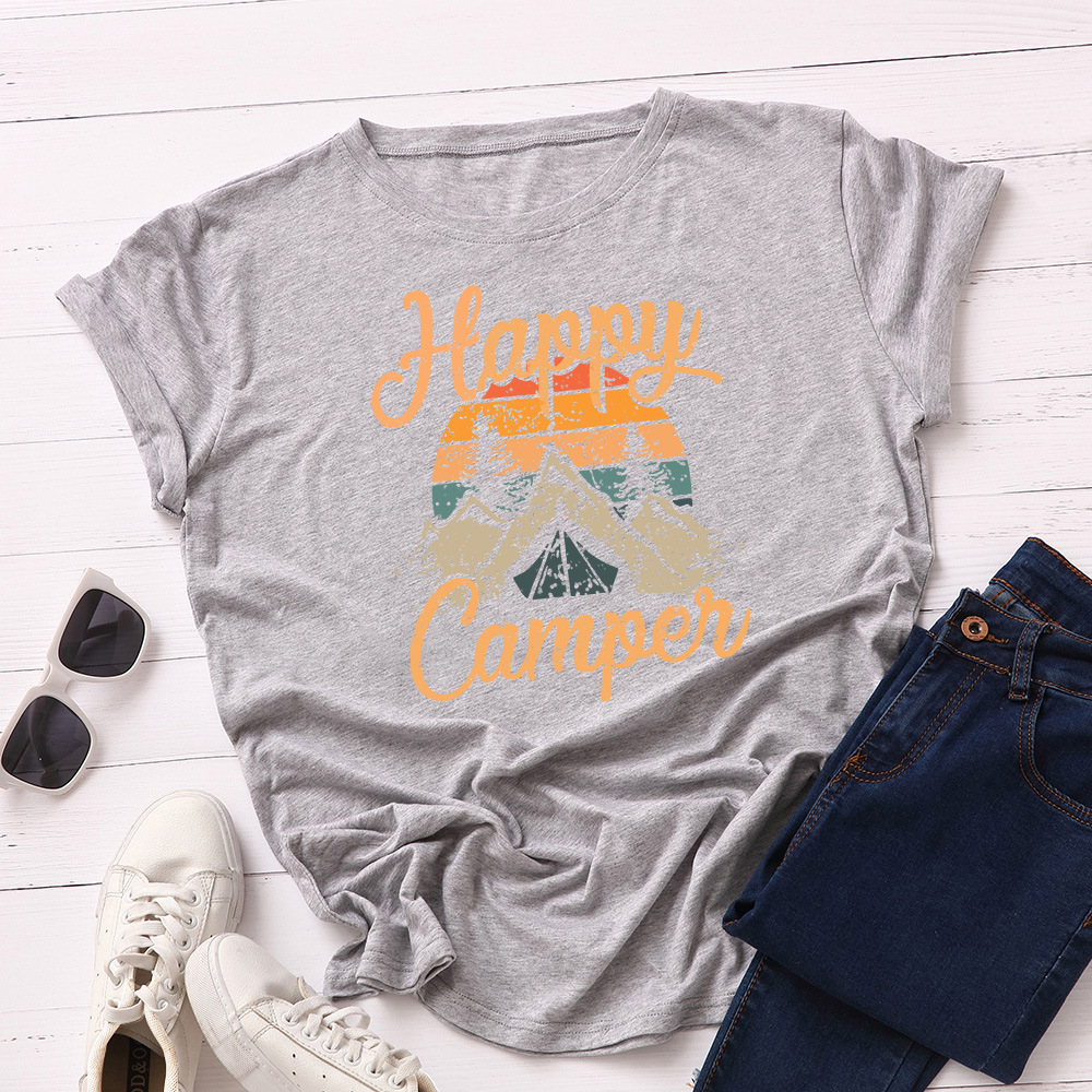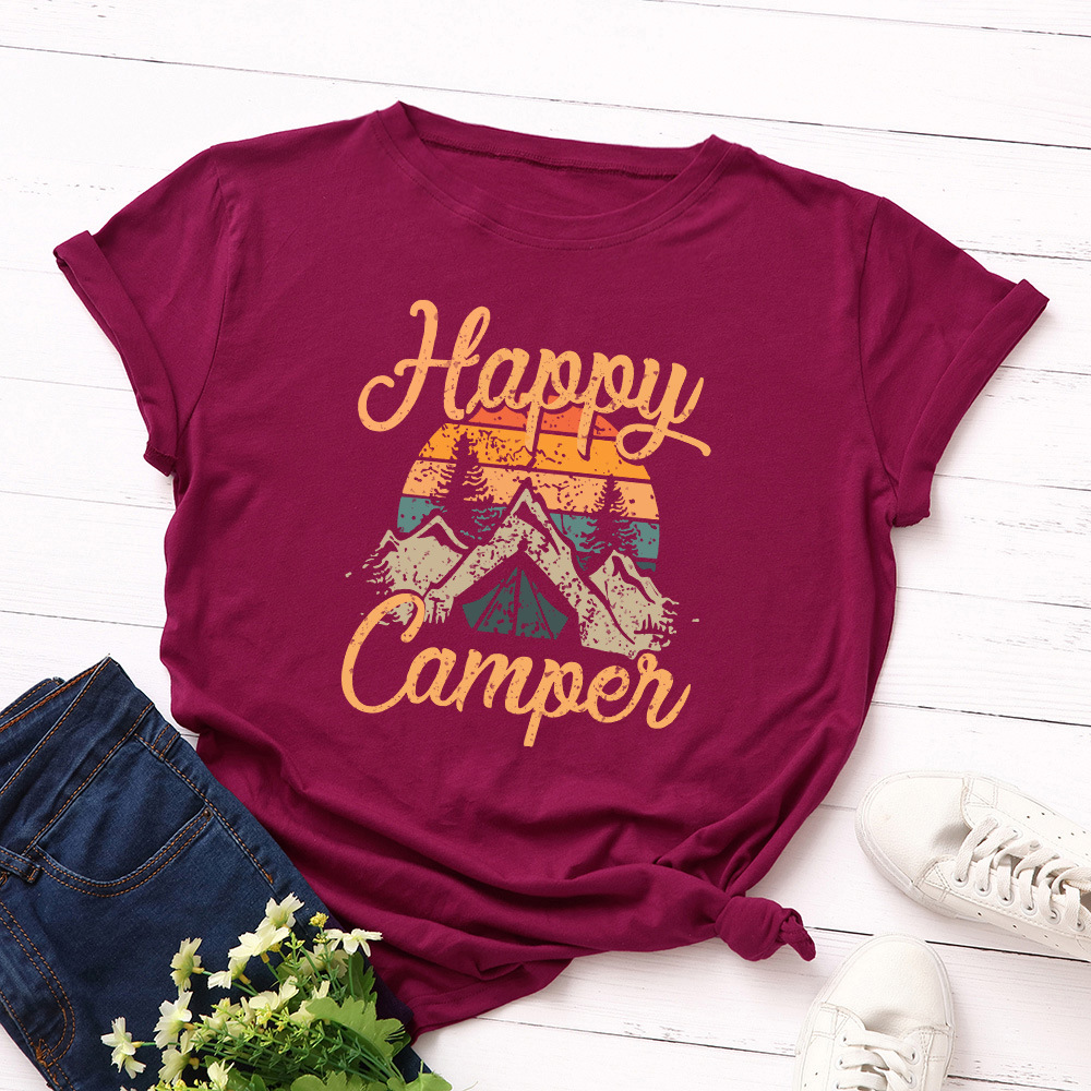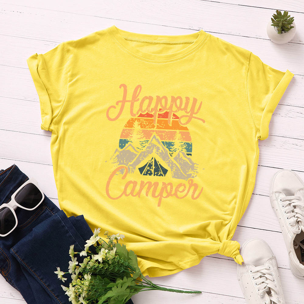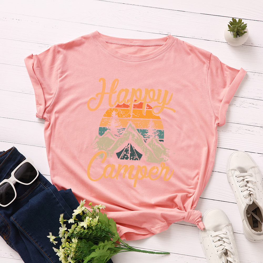 코튼 아마존 재고 대외 무역 크로스 보더 유럽과 미국 여성의 느슨한 라운드 넥 반팔 티셔츠 여성용 HAPPY CAMPEN