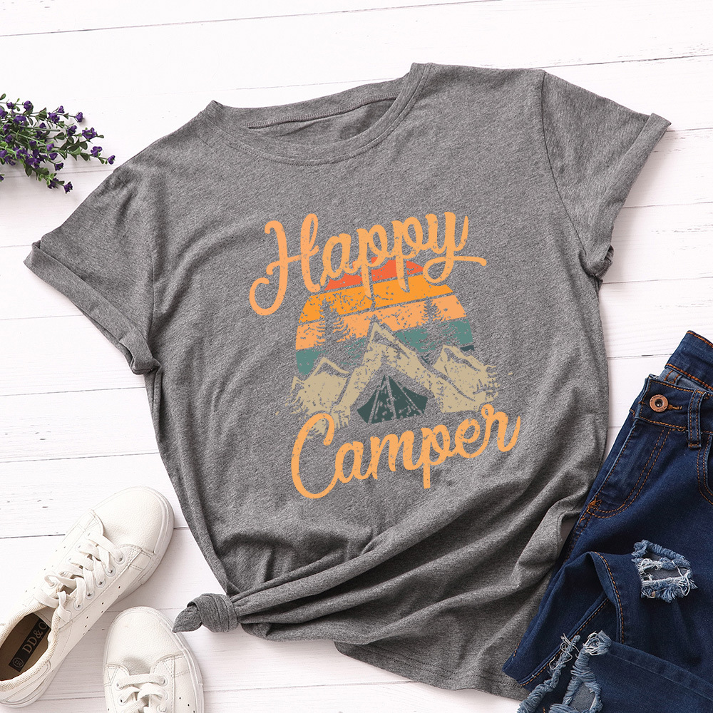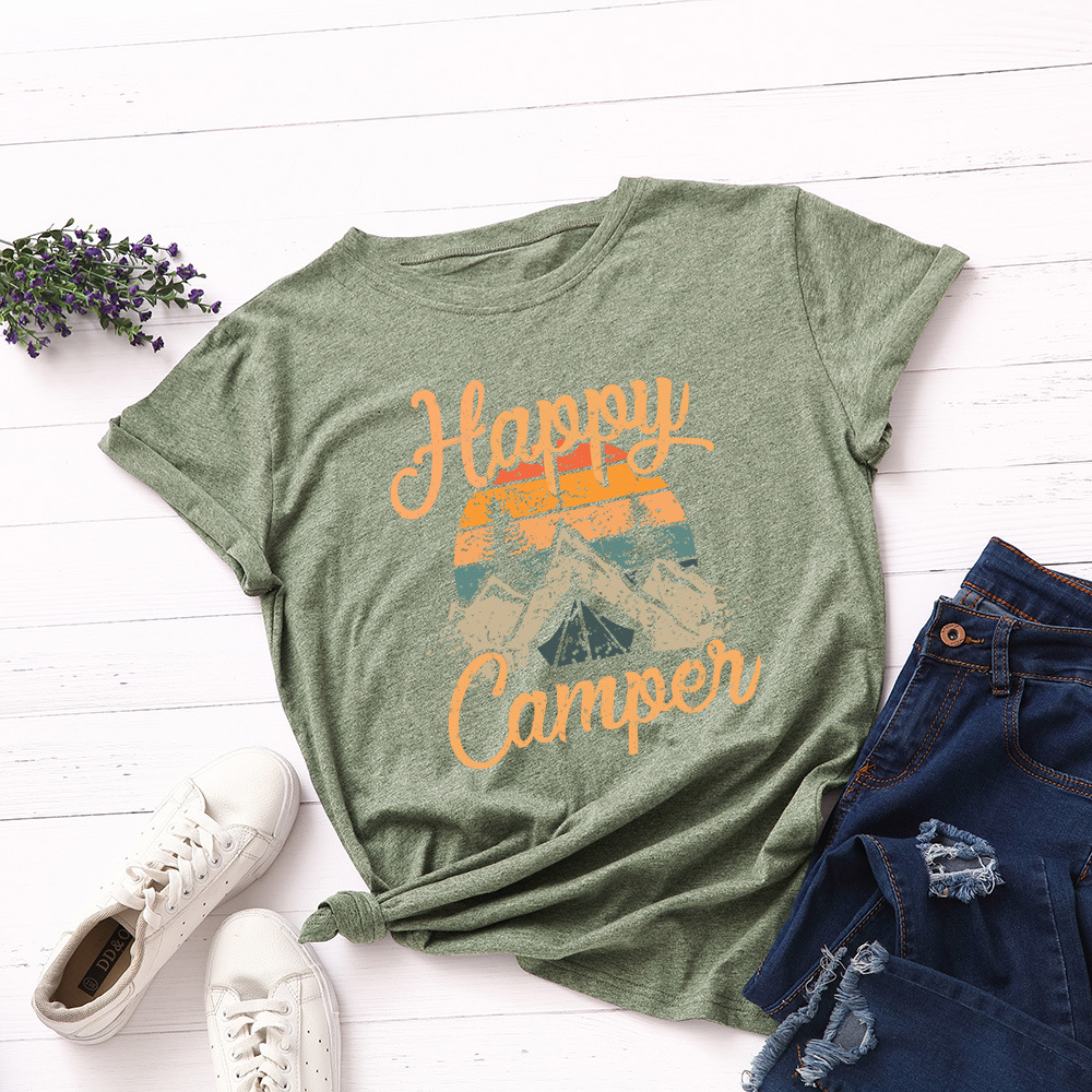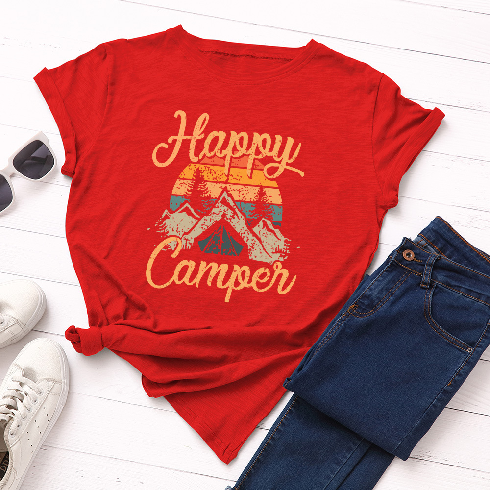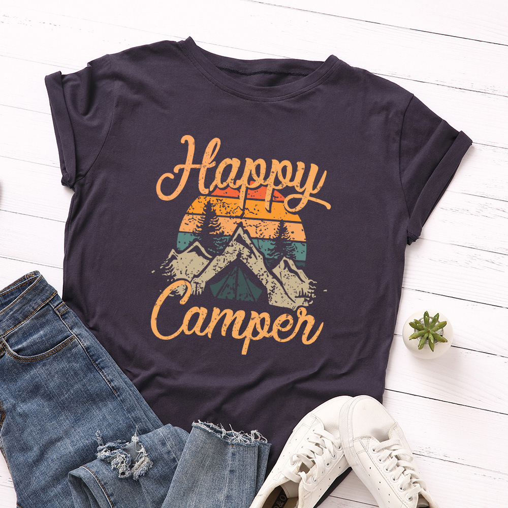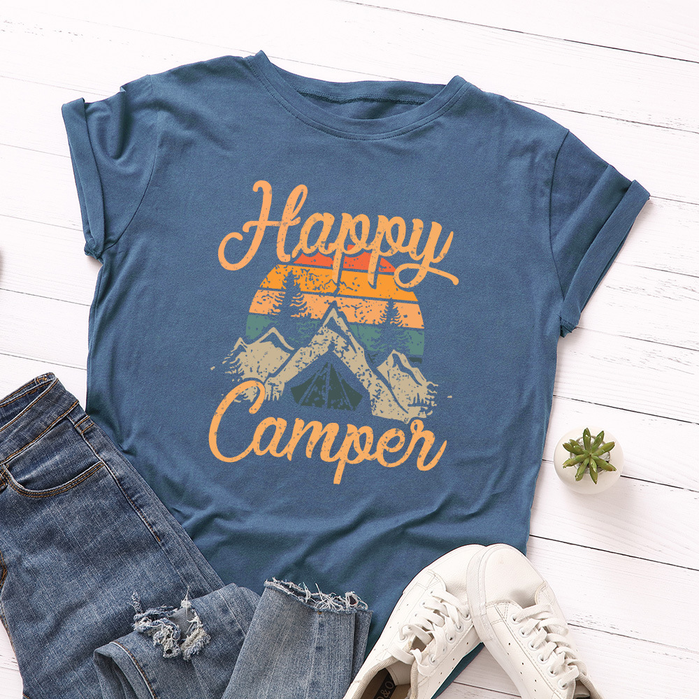 코튼 아마존 재고 대외 무역 크로스 보더 유럽과 미국 여성의 느슨한 라운드 넥 반팔 티셔츠 여성용 HAPPY CAMPEN