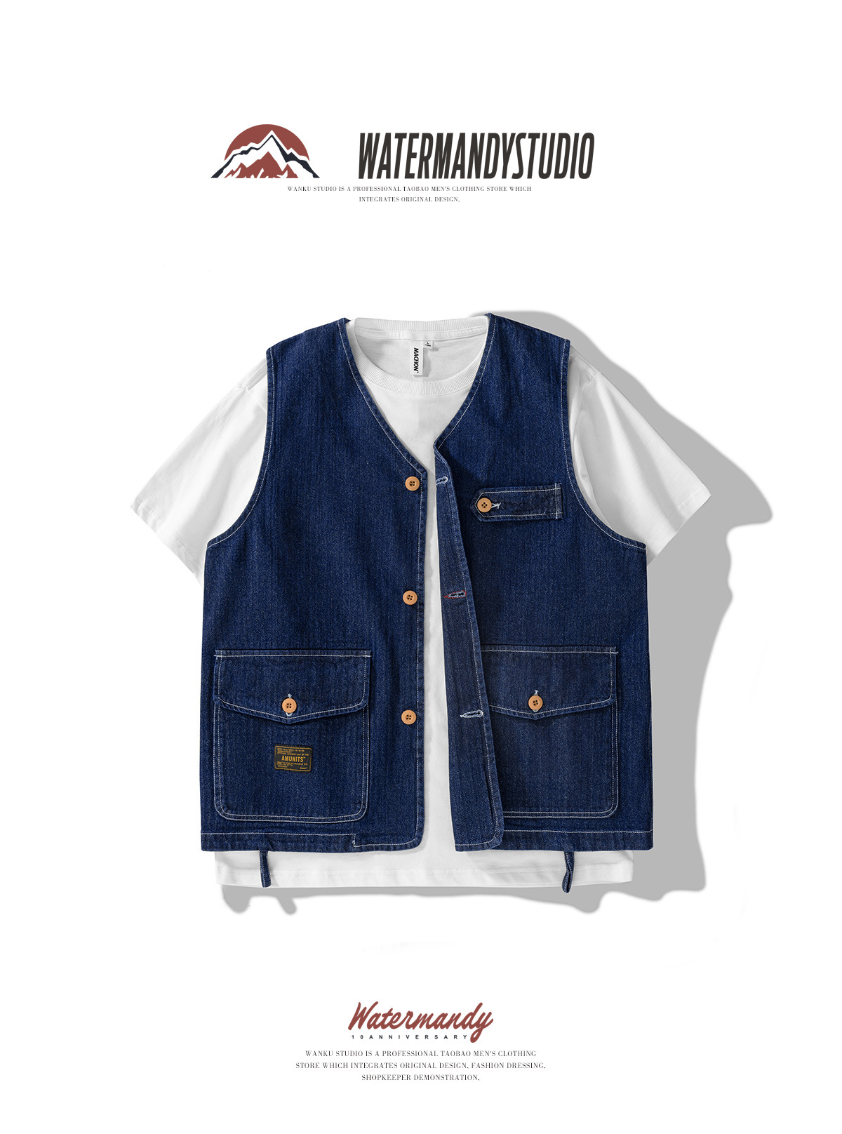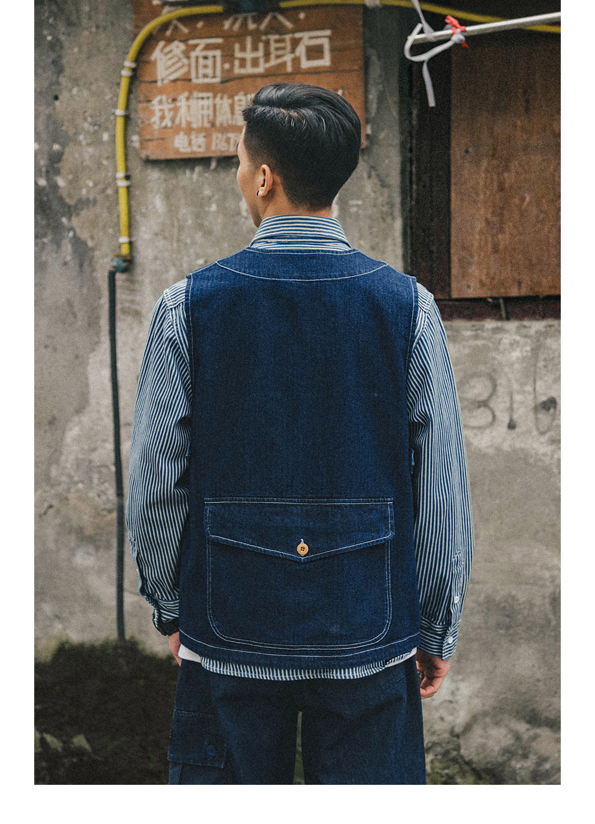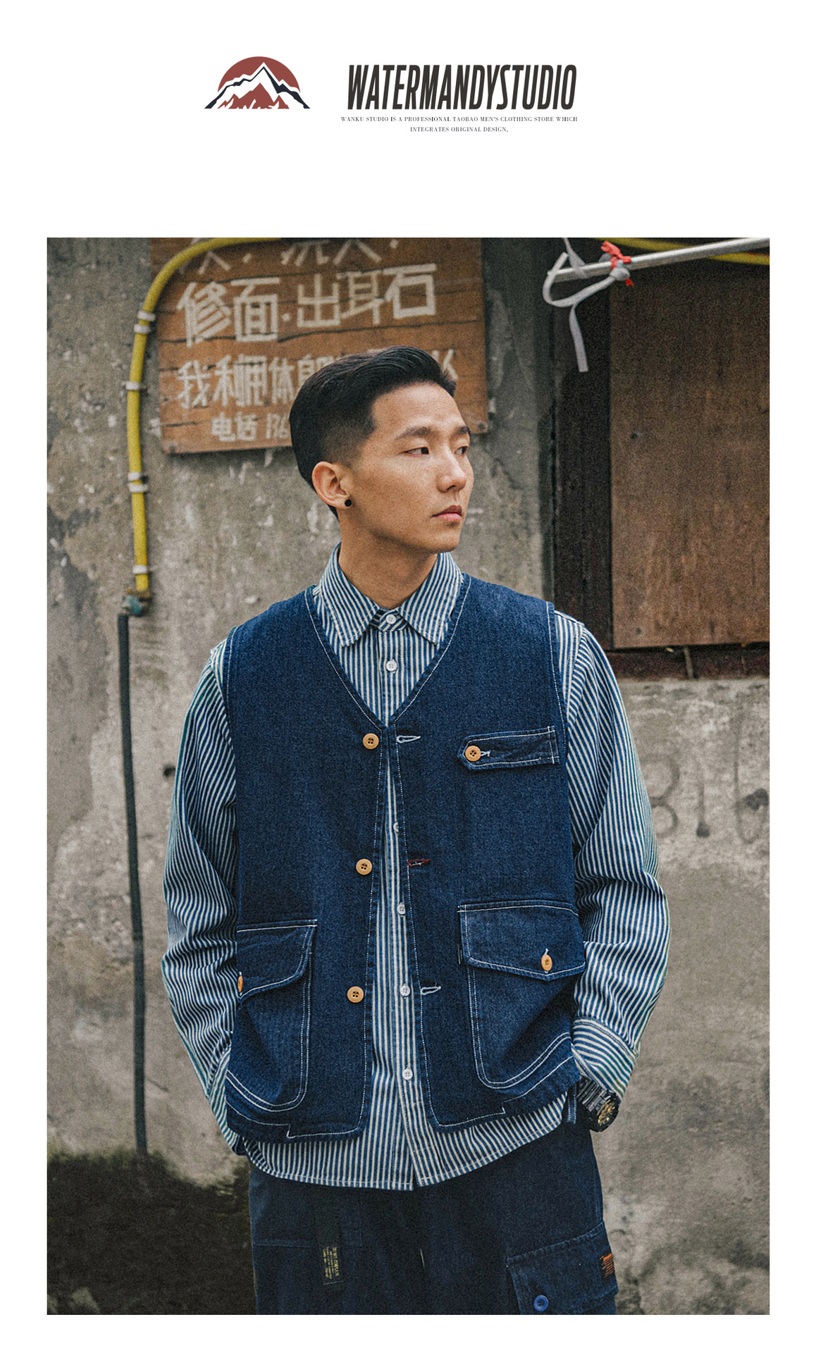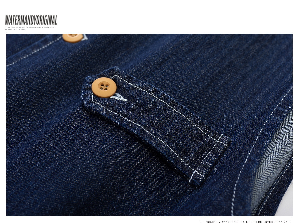 沃曼缔复古 纯正美式水洗阿美咔叽重磅丹宁人字纹牛仔工装马甲男