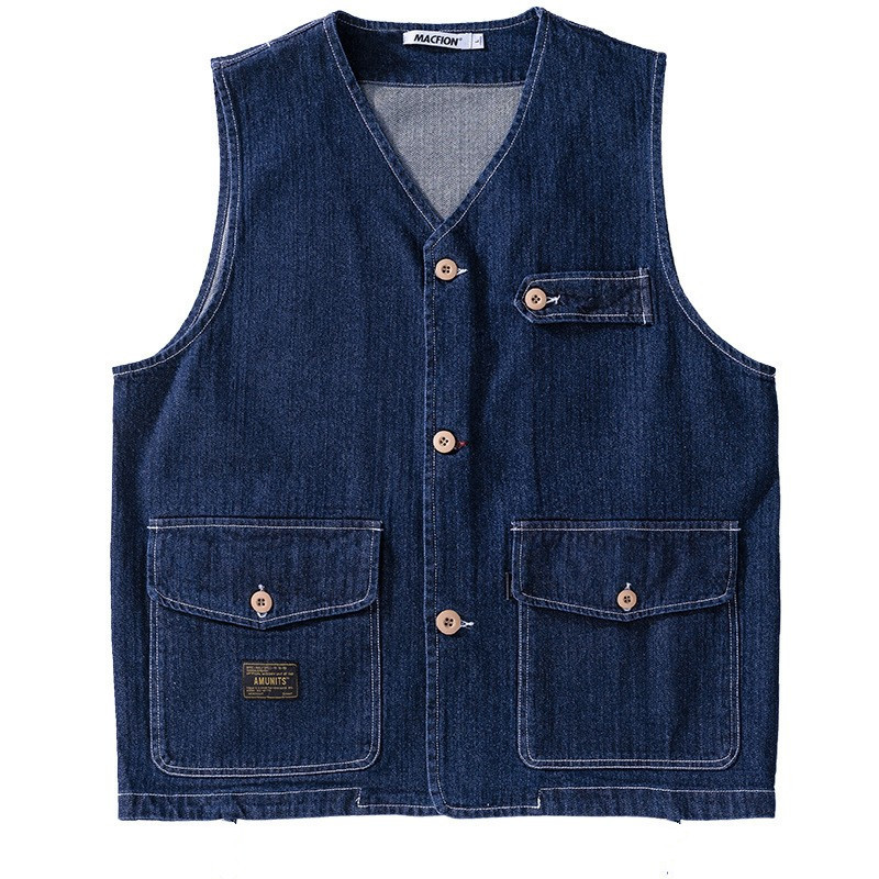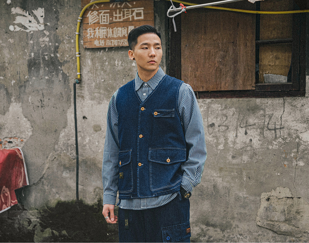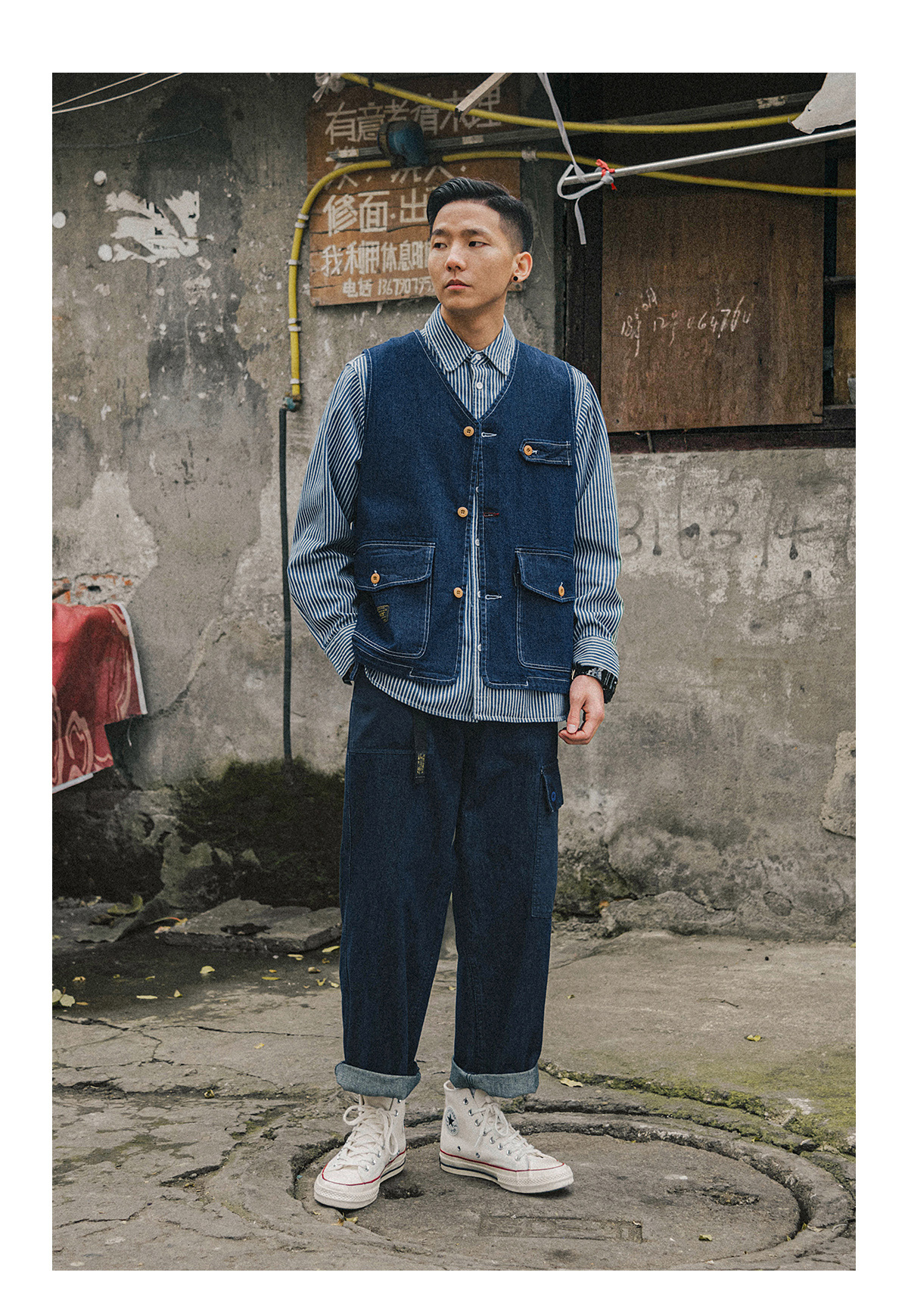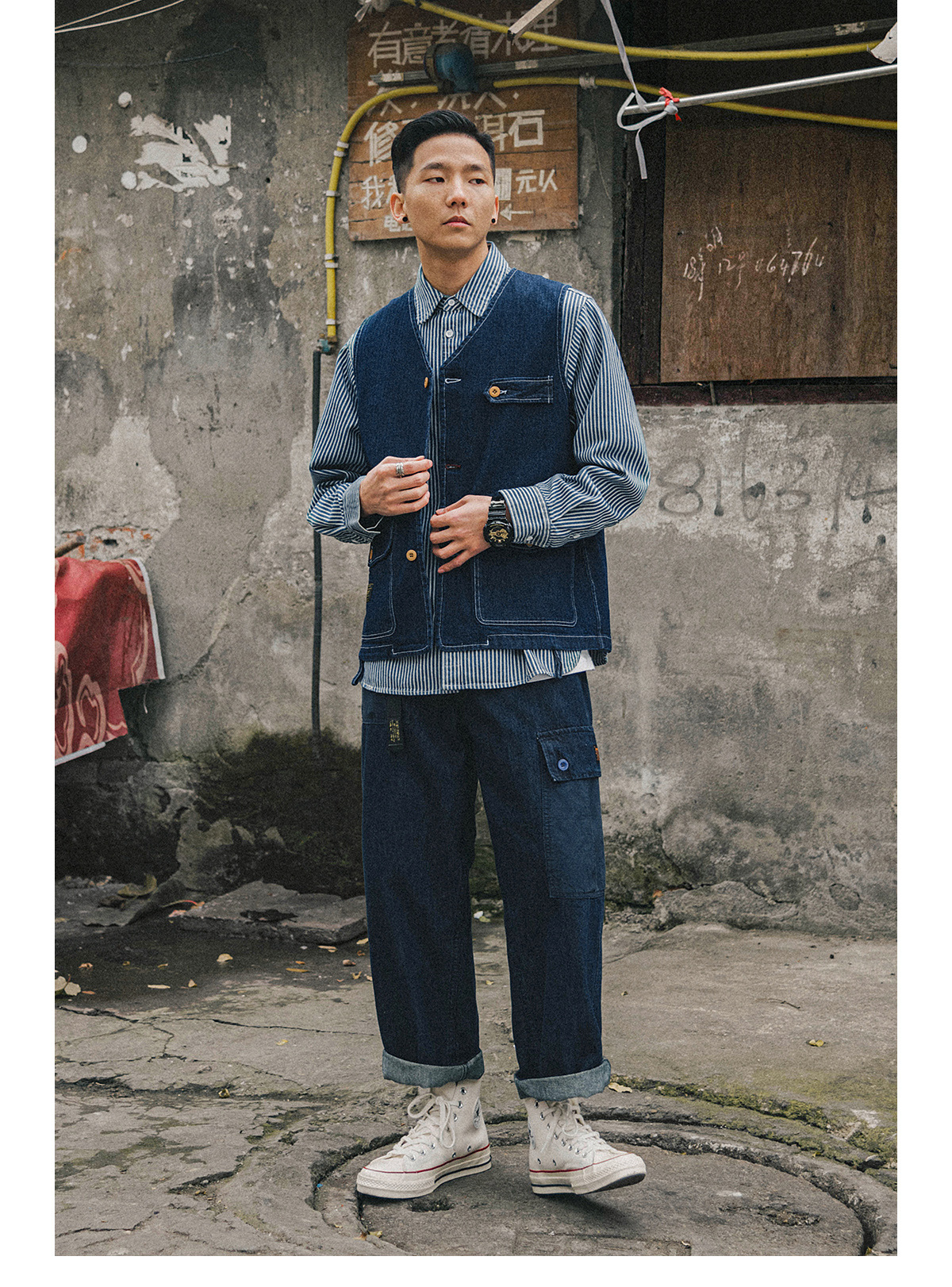 沃曼缔复古 纯正美式水洗阿美咔叽重磅丹宁人字纹牛仔工装马甲男