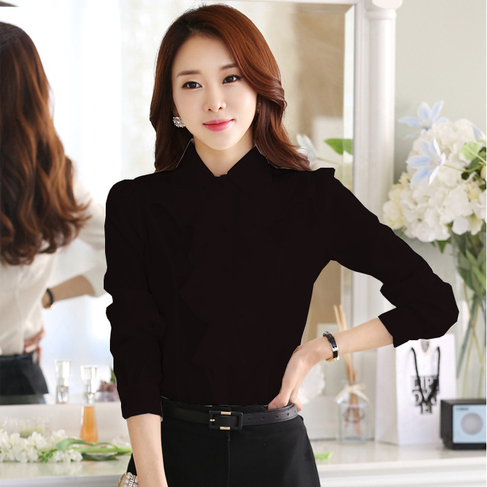 产品特点:采用立体修身裁剪,简约时尚的设计,非常具有OL通勤气质的衬衫,极富女人味的工艺进行整合,女性化十足的贴合曲线度;精致剪裁的胸前小褶皱花边衬托女性美感!