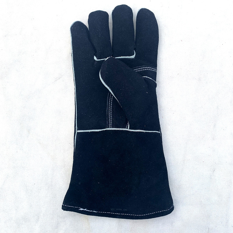 普通的手工焊手套所谓手工焊,就是我们平时常见的一把钳子夹住焊条的这种焊接。这类焊高温飞溅物多。所以用的手套多为加里的双层。长度也在34CM以上。