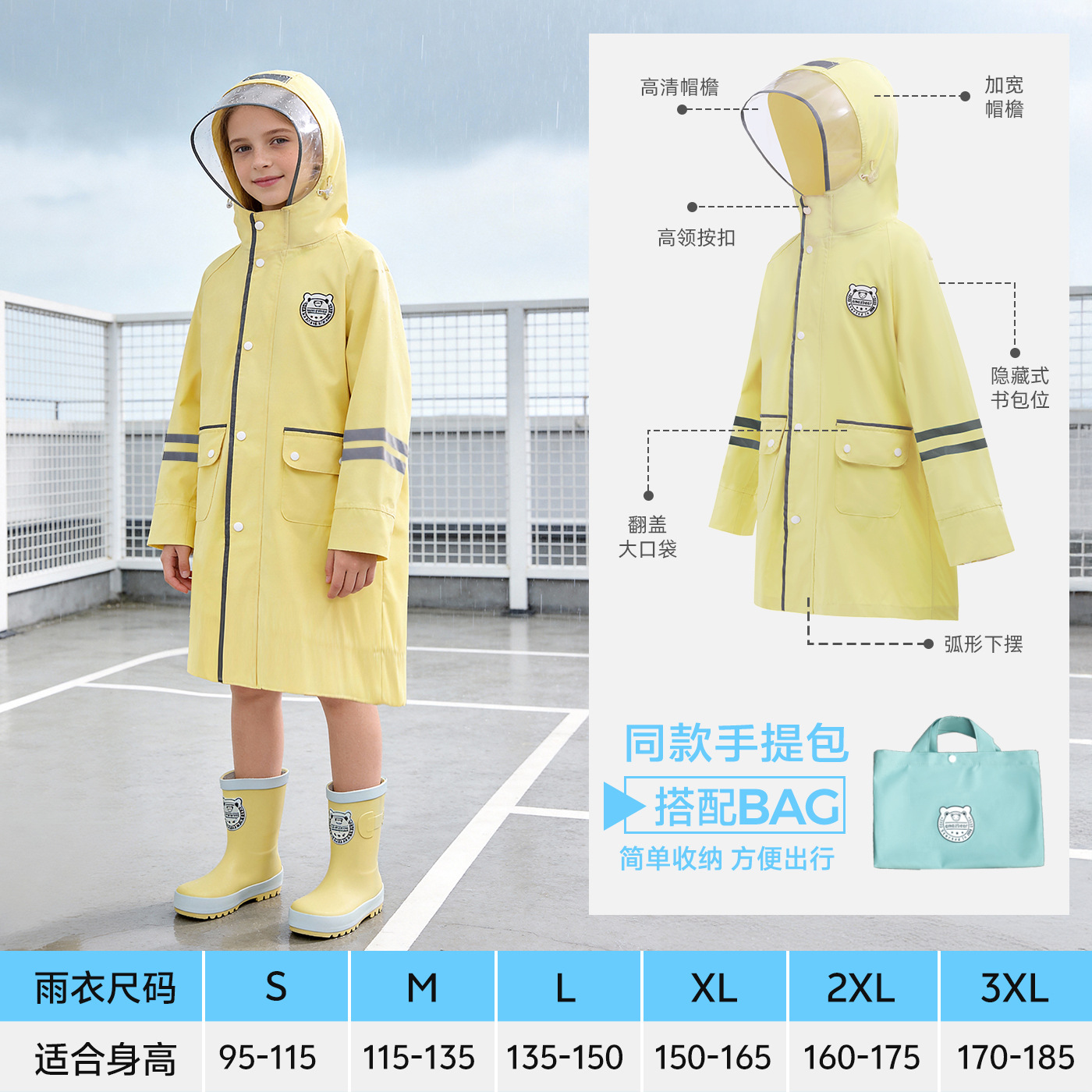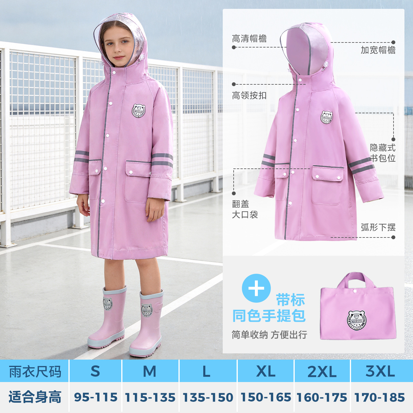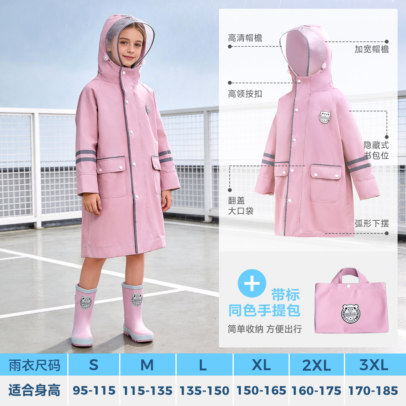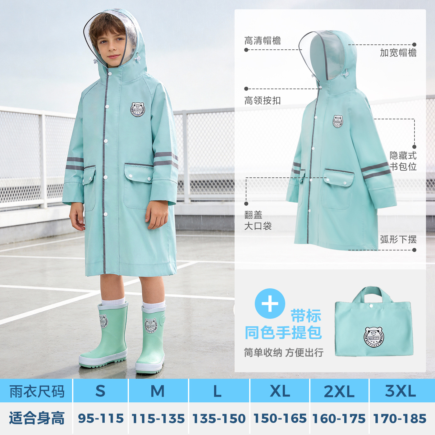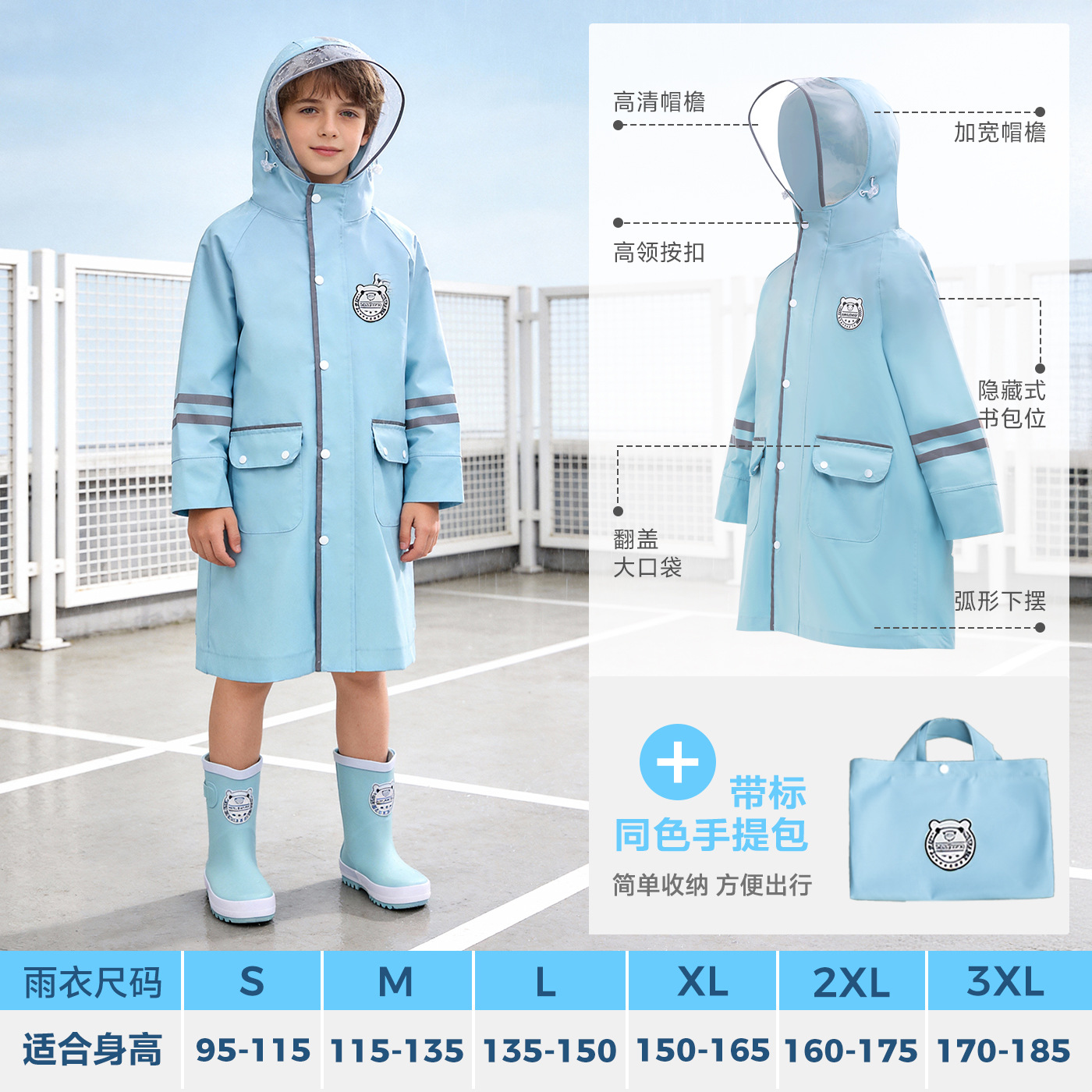 한국 인기 아동용 우비 초등학생 남아 유치원생 6-12세 통학용 롱형 가방 수납 가능 우비