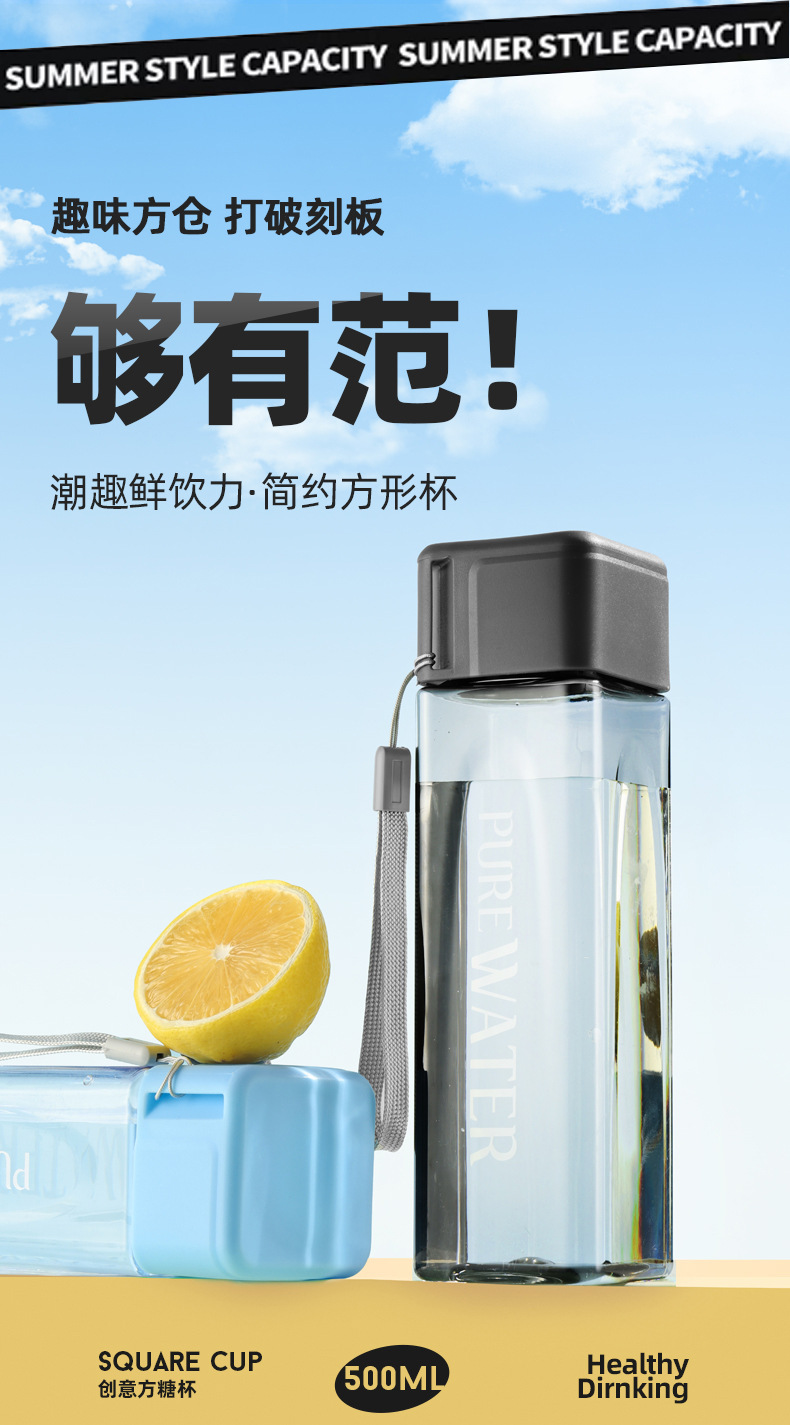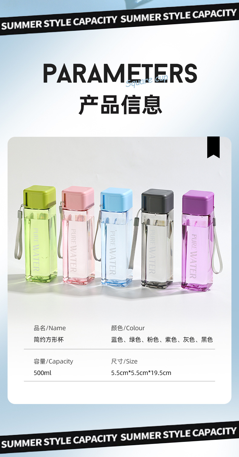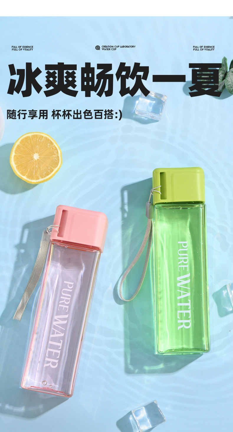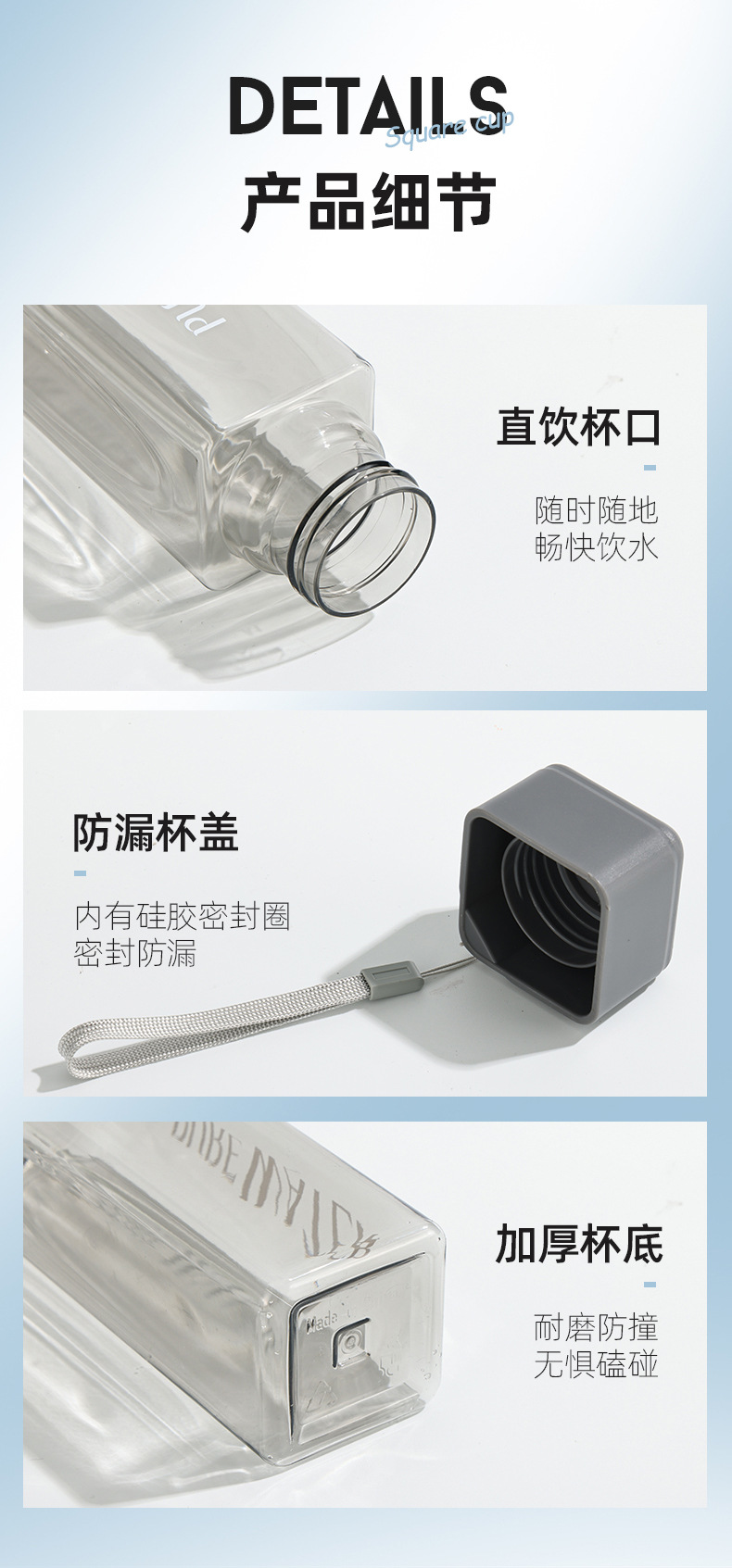 대용량 플라스틱 컵 도매 인기 창의적 심플 사각형 스포츠 물병 내구성 방수 투명 플라스틱 컵스토어 가기