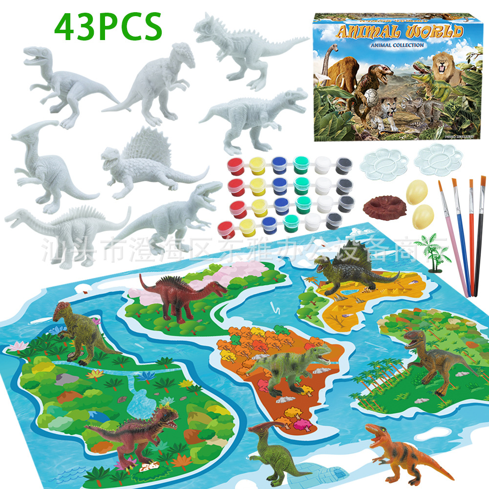 跨境DIY彩绘实心恐龙白坯模型手绘画涂鸦恐龙游戏垫套装43件套 儿童玩具