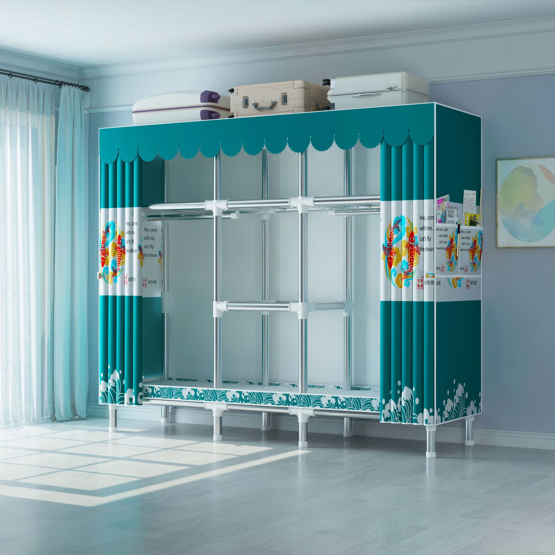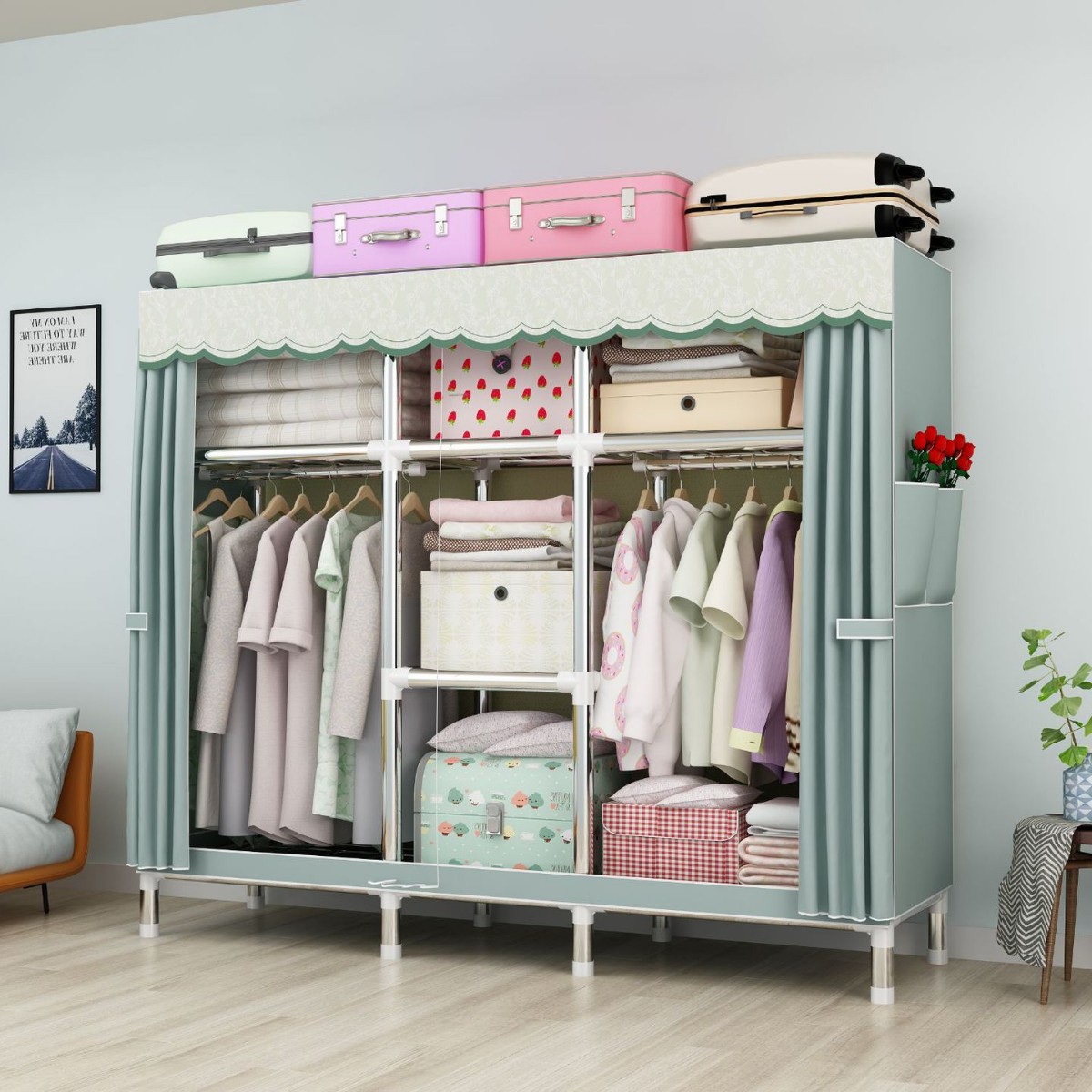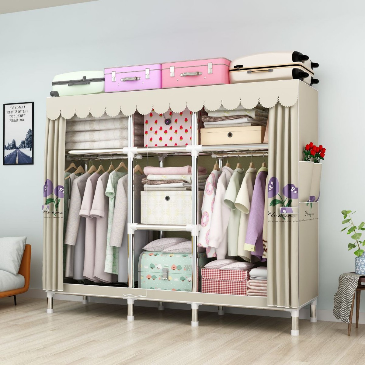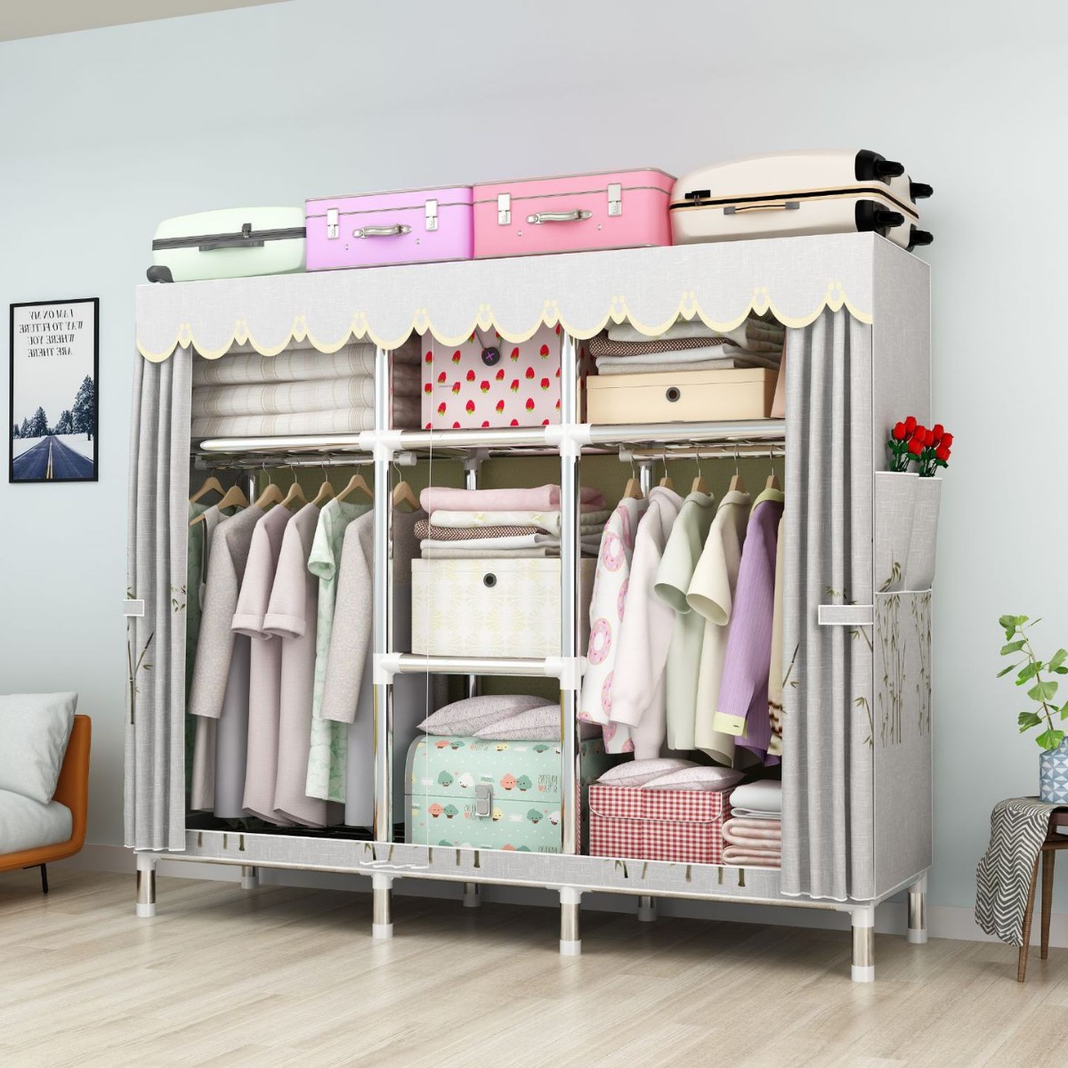 간단한 옷장 강철 파이프 대담한 강화 임대 룸 수납 옷장 패브릭 어셈블리 폴리 에스터 면 옷장 홈 침실