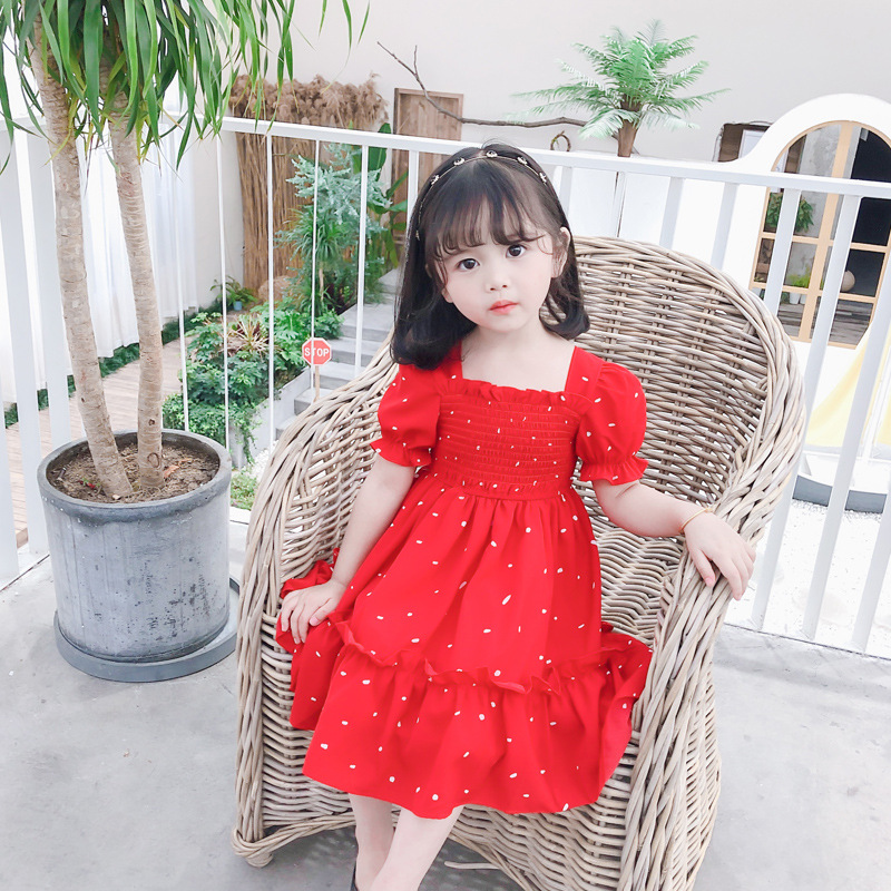 2025 여름 아동복 도매 중소형 여아 원피스 레드 도트무늬 캐주얼 아동복 아동 원피스 공장 트렌드