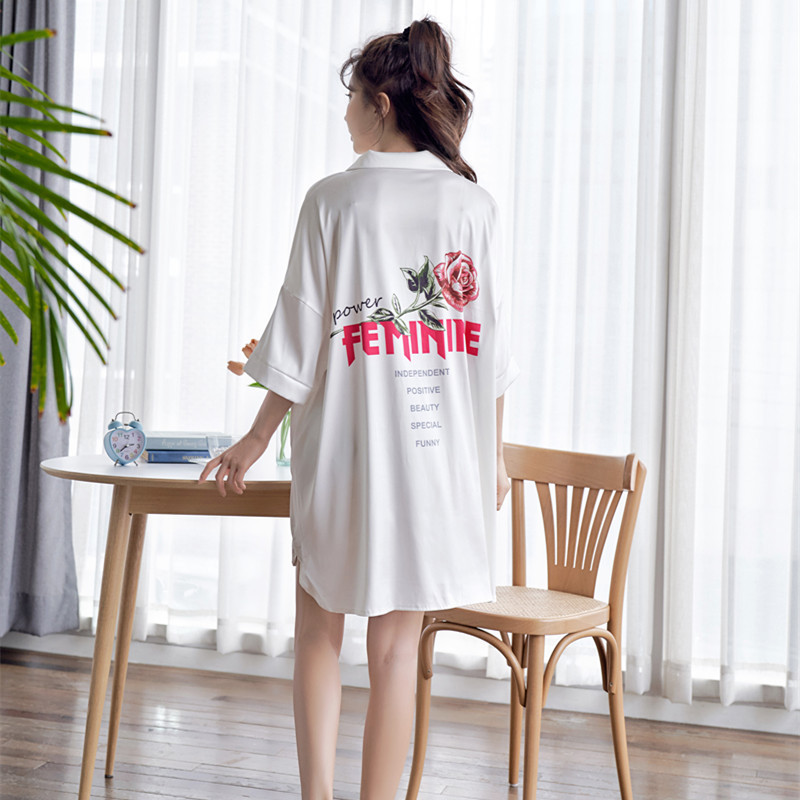 여름 특대 스타일 잠옷 여자의 아이스 실크 가정 옷 아웃웨어 짧은 소매 섹시한 남자 친구 스타일 셔츠 잠옷스토어 가기