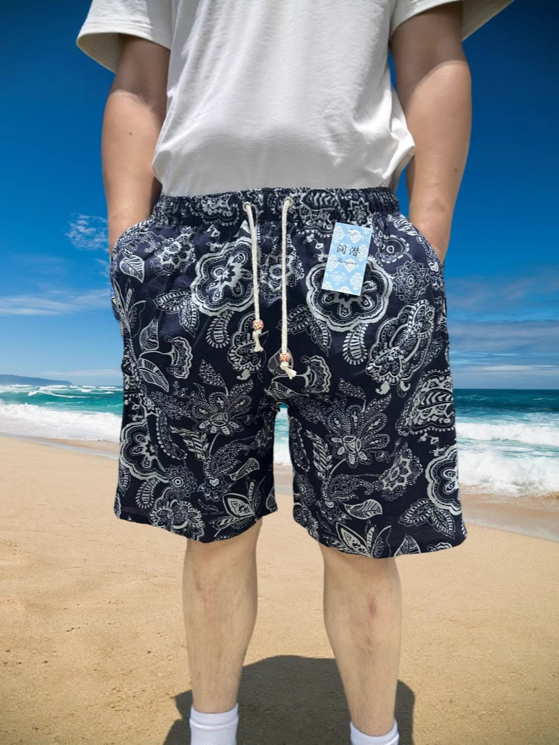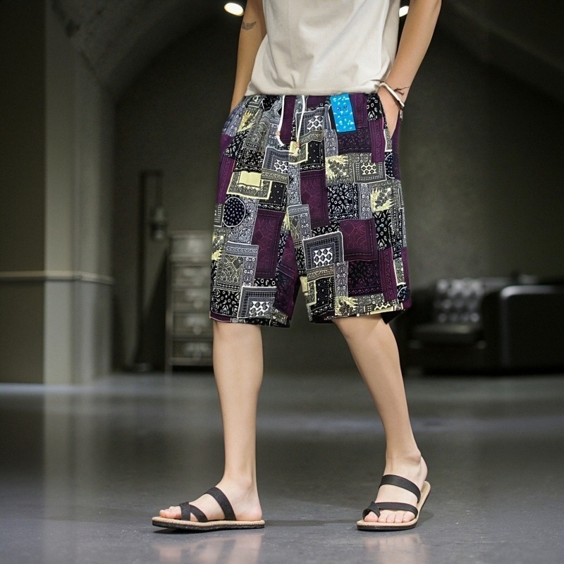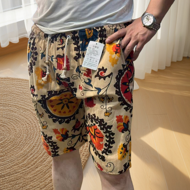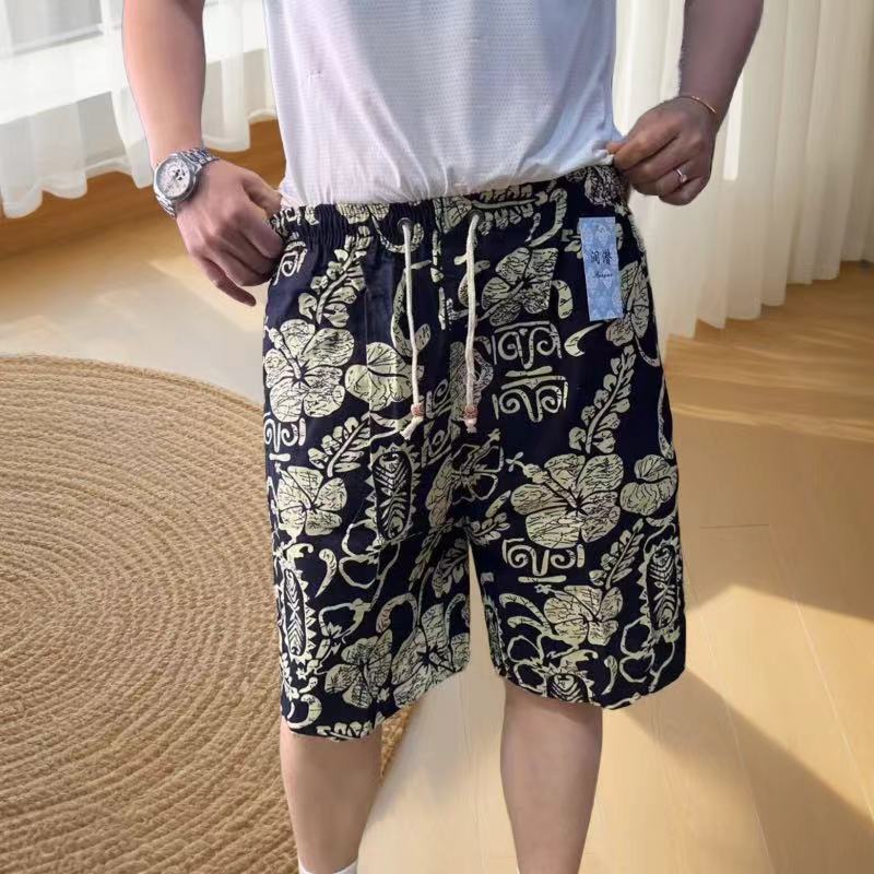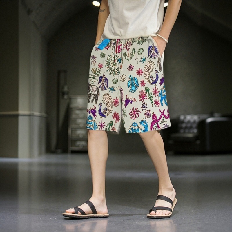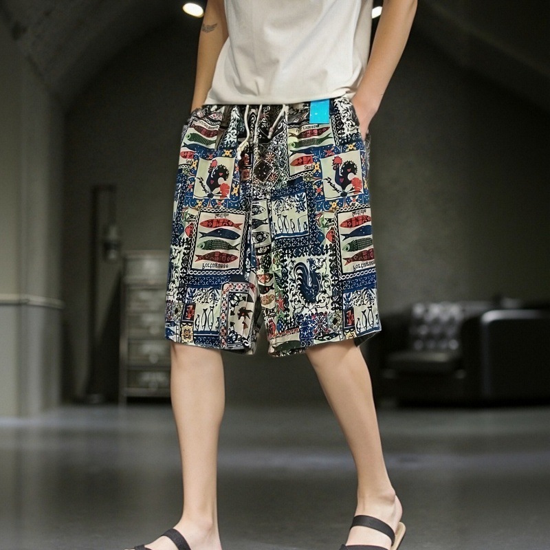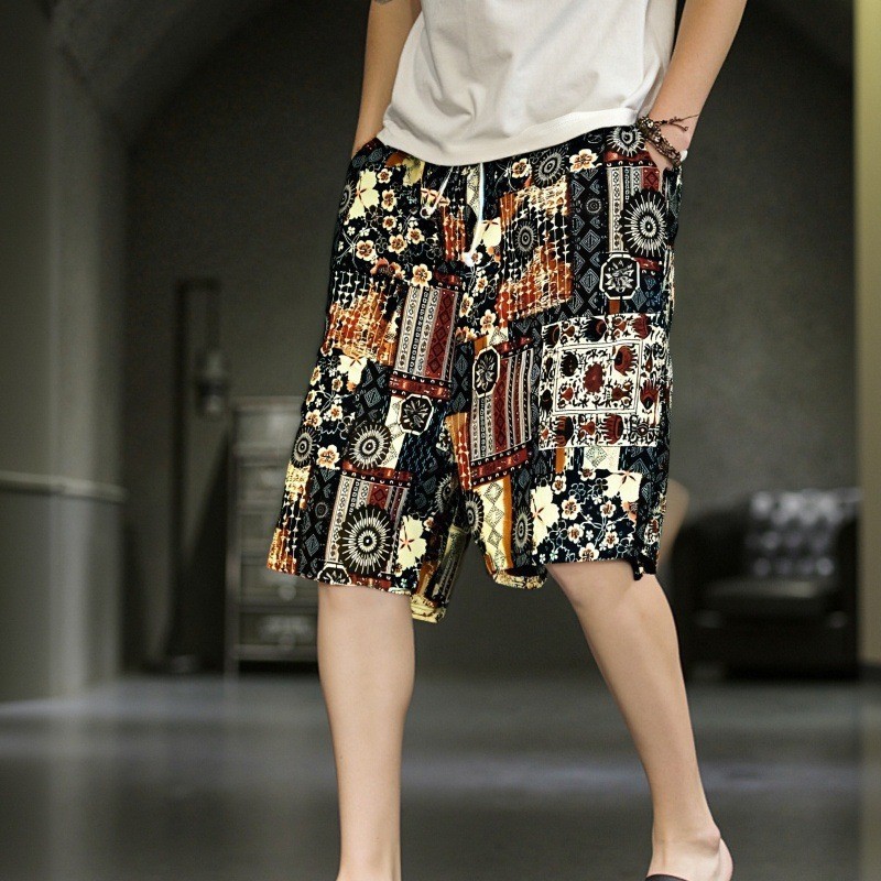 여름 비치 팬츠 남성 스포츠 레저 휴가 빅 팬츠 에스닉 스타일 미드 팬츠 래프팅 속건성 코튼 린넨 남성 꽃무늬 반바지스토어 가기
