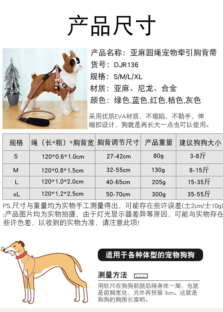 도매용 린넨 원형 로프 애완견 목줄 조절 가능한 중소형견용 가슴줄 용품 신축성 있음