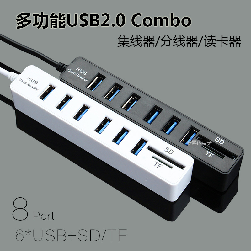 产品信息读卡器只能同时读一种卡,例如:在插入SD卡的同时,不能再同时插其他卡,否则会认不到卡(其实一般人也不会同时间读多个卡)。读卡的同时HUB可以同时工作,互不影响;- 此USB Hub实测能带动80G移动硬盘,大容量的移动硬盘未经测试过,可能会带不动。兼备2.0 HUB功能和多合一读卡器,做工质量好* 一个USB接口扩展为三个,小巧、实用、方便,扩展3个2.0USB接口,每个供电高达500MA* 采用第二代USB HUB控制器* 直接与电脑相连, 无须外接电源,简单好用* 电脑自动识别安装, 无须驱动程序,即插即用,插拔* USB2.0接口,支持USB1.0/1.1,传输速度1.5/12/480MBPS* 内置电流过载短路保护装置读卡器加集线器.