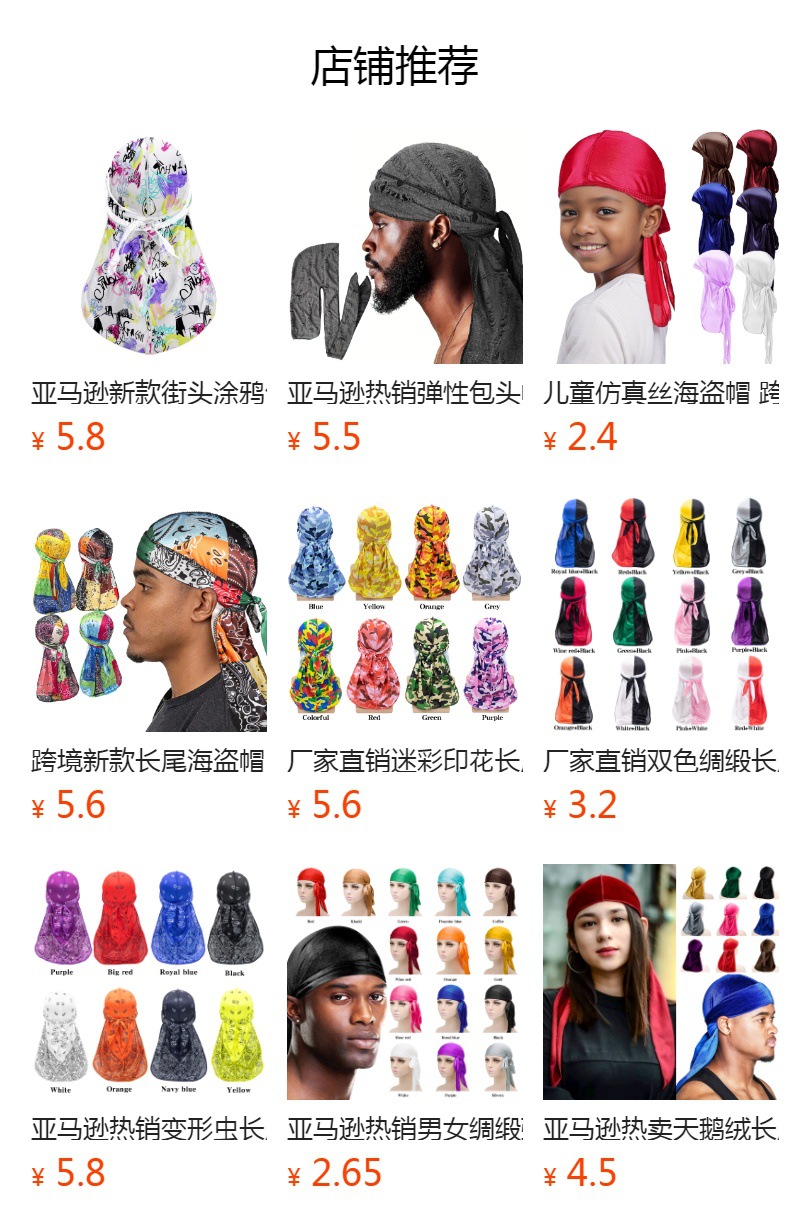 아마존 뜨거운 판매 남성과 여성의 새틴 탄성 발가락 모자 시뮬레이션 실크 두꺼운 긴 꼬리 해적 모자 실크 durag스토어 가기