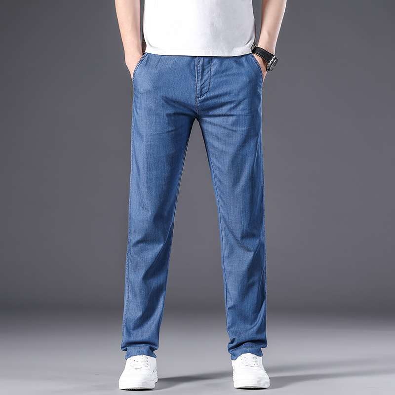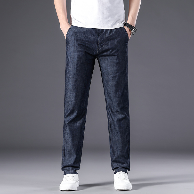 여름 얇은 청바지 남자의 모달 비즈니스 얇은 아빠 미드 웨이스트 탄성 스트레이트 느슨한 캐주얼 아이스 실크 바지스토어 가기