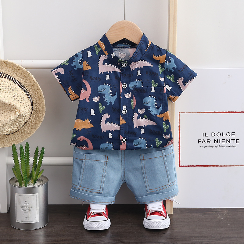 어린이 의류 2023 여름 새로운 중소 소년 크로스 국경 새로운 문자 공룡 셔츠 청바지 세트 의 한국어 버전