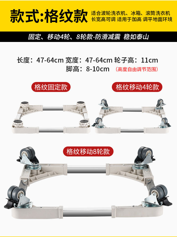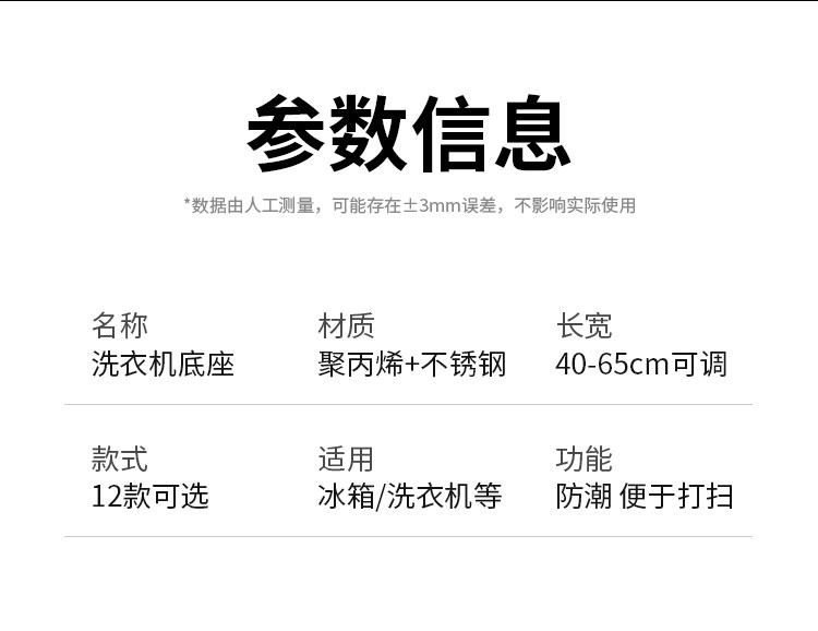 本产品适用于单筒、滚筒、波轮洗衣机,上下门冰箱、消毒碗柜、洗碗机等,在产品尺寸范围内都是可以使用。超出尺寸范围可以联系客服定制。