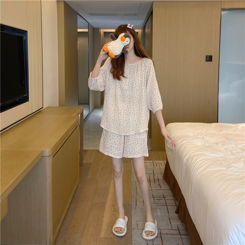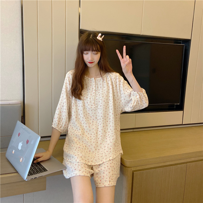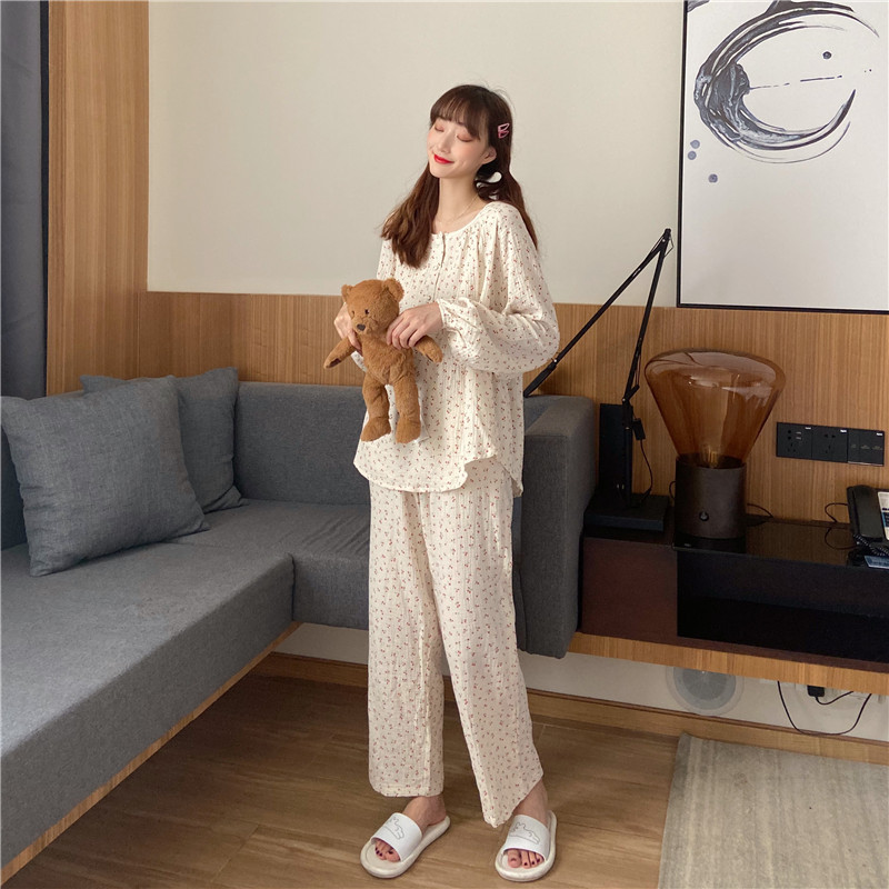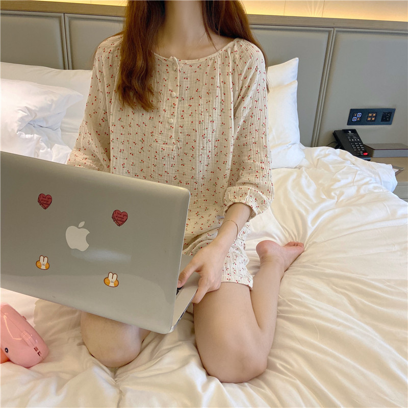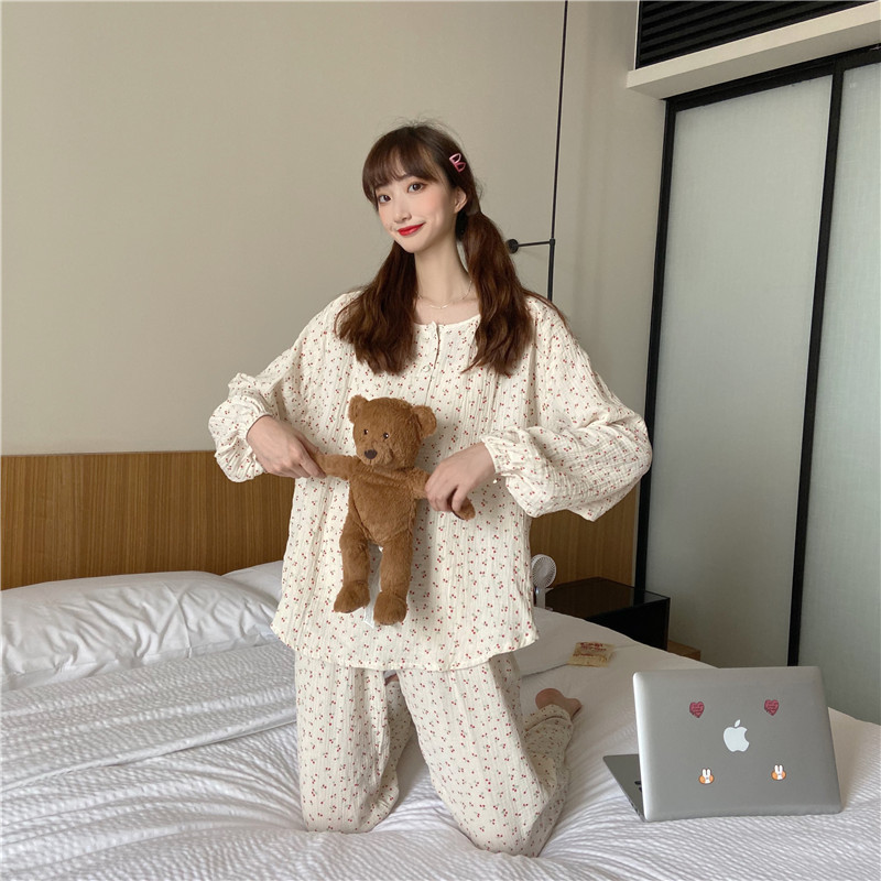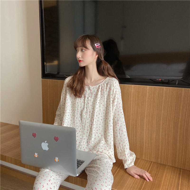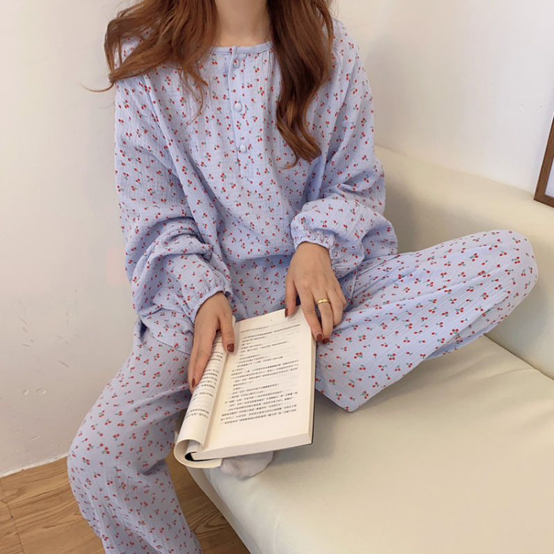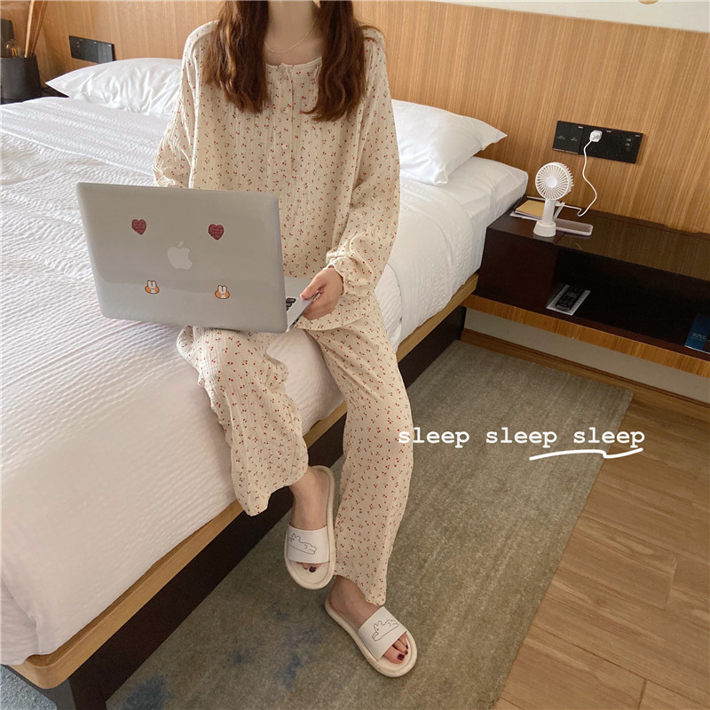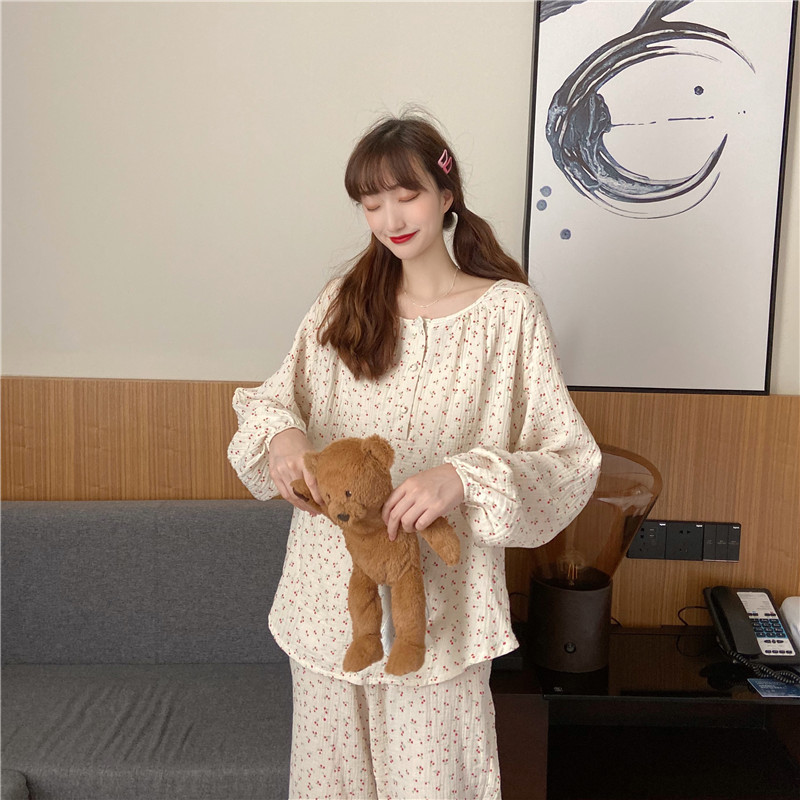 2022 가을과 겨울 한국어 in 여성 체리 피부 친화 면사 가정 옷 에어컨 잠옷 세트스토어 가기