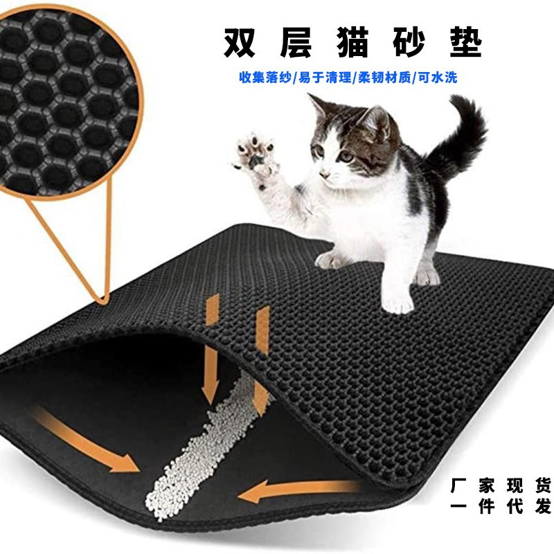 产品功能:适用95%以上种类的猫砂,上层通孔材料,猫砂可轻易通过,下层防水材质,猫砂、小便等脏物可聚集于此。猫砂垫为上下双层设计:上层采用六角形的洞孔凹凸设计,除了让猫砂落入后不再溅出外,圆球型的柔滑触感也可以避免猫咪抓坏,下层垫密封专门存放猫砂,底部设计成规则性的圆孔,有效防滑避免横冲直撞的猫咪滑到受伤。